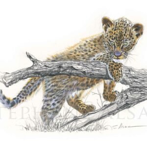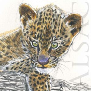 Dessin à l’aquarelle original réalisée par Stéphane Alsac, artiste animalier contemporain: Un très jeune léopard.