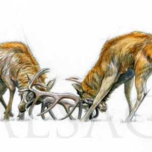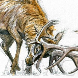 Original watercolor painting by Stéphane Alsac, contemporary wildlife artist  : A drawing of a fight of two deers