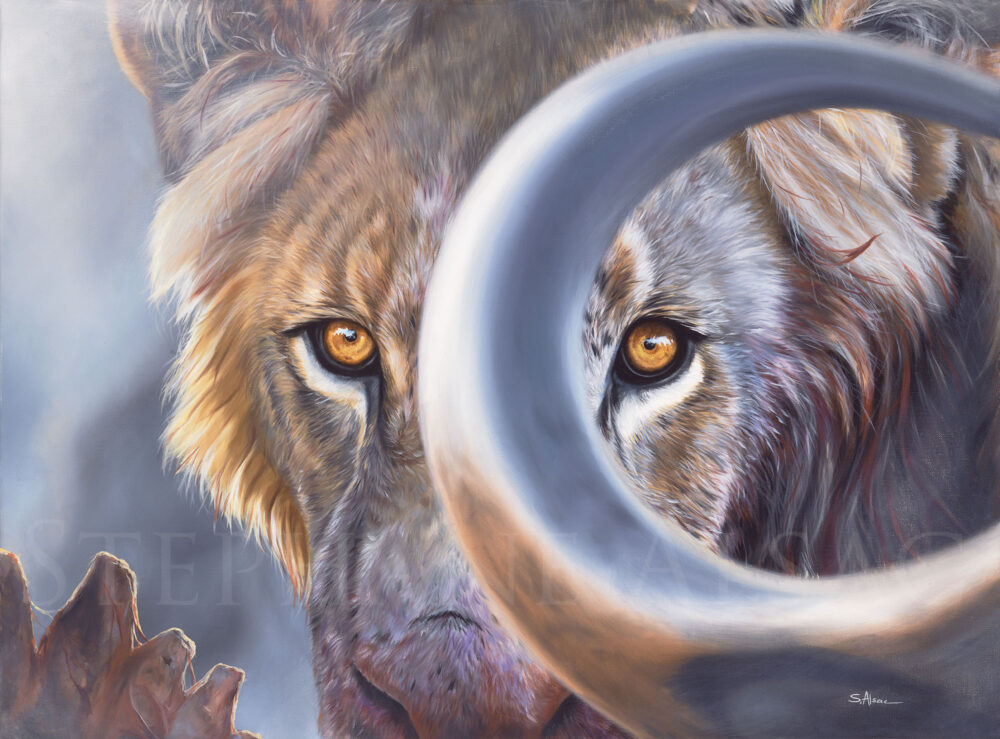 tableau-lion-proie-hyper-realiste-peinture-huile-felin-alsac