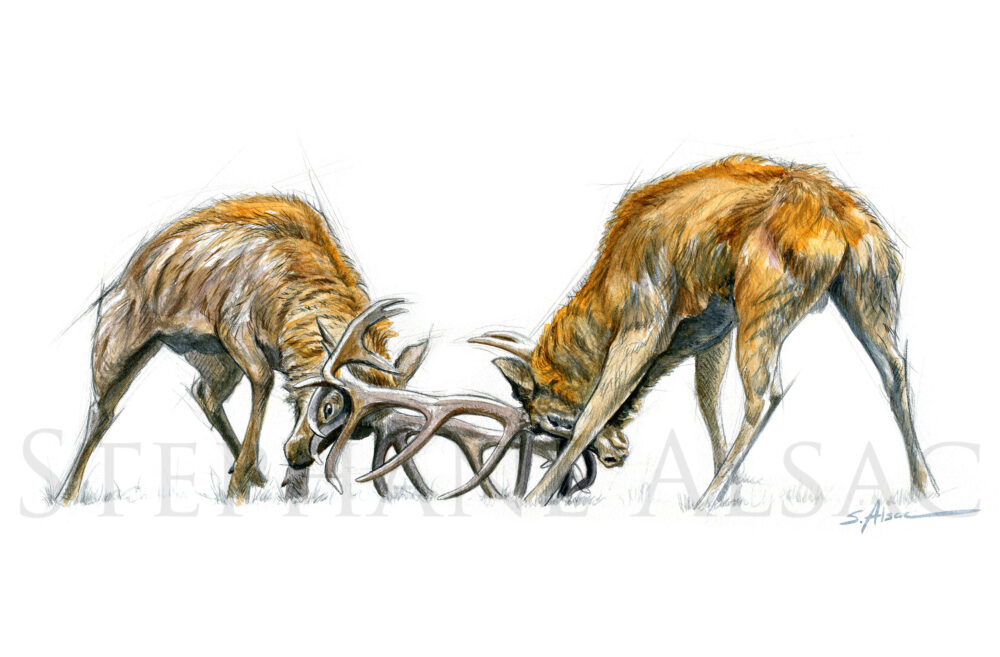 illustration-tableau-dessin-combat-cerfs-aquarelle-art-animalier