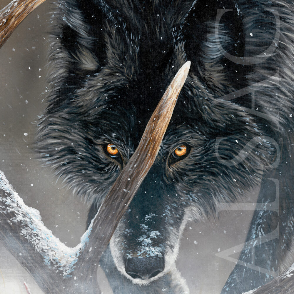 tableau-peinture-portrait-loup-noir-neige-yeux