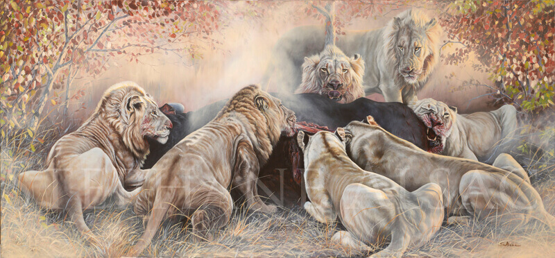 Peinture de lions et lionnes dévorant un buffle dans le Timbavati – Œuvre Originale en vente . Stéphane Alsac, Artiste Peintre des animaux d’Afrique.