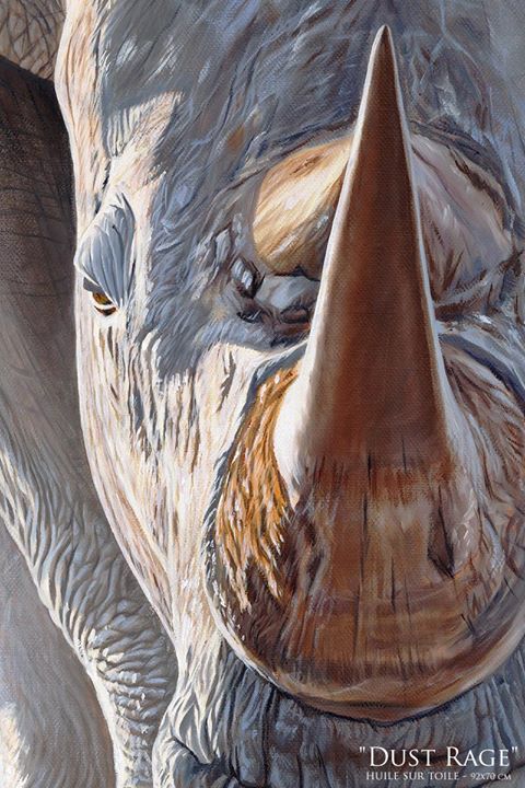 Cette peinture intitulée “Dust Rage” est un hommage aux Rhinocéros. Le sujet principal du tableau est la corne, à la fois ce qui caractérise le rhinocéros mais aussi ce qui le met en danger.