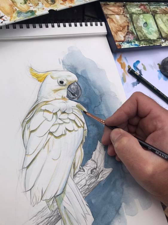 superbe portrait de Cacatoès & d’autant plus que l’éffet mouillé sur mouillé crée une atmosphère humide& tropicale chapeau bas l’artiste j’apprécie vraiment !