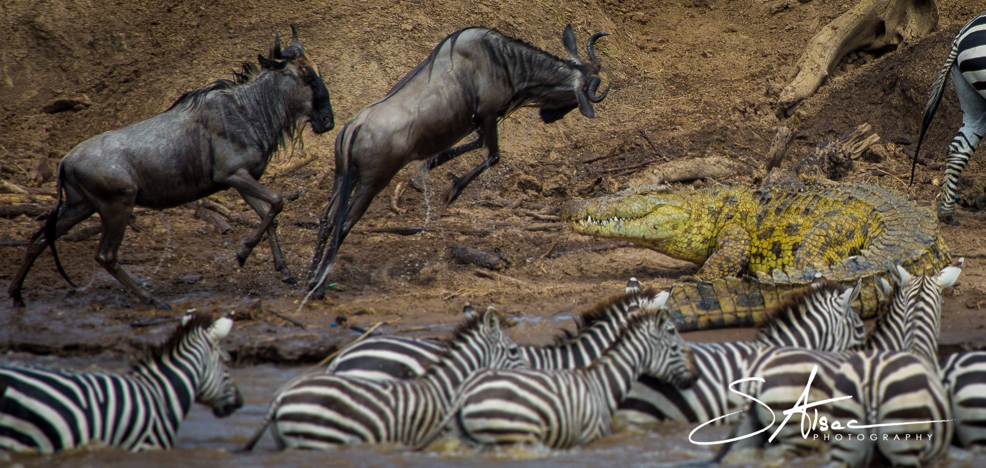 Le Masaï-Mara en juillet, c’est aussi le début de la grande migration, l’occasion pour les crocos de manger un bout … ou pas !