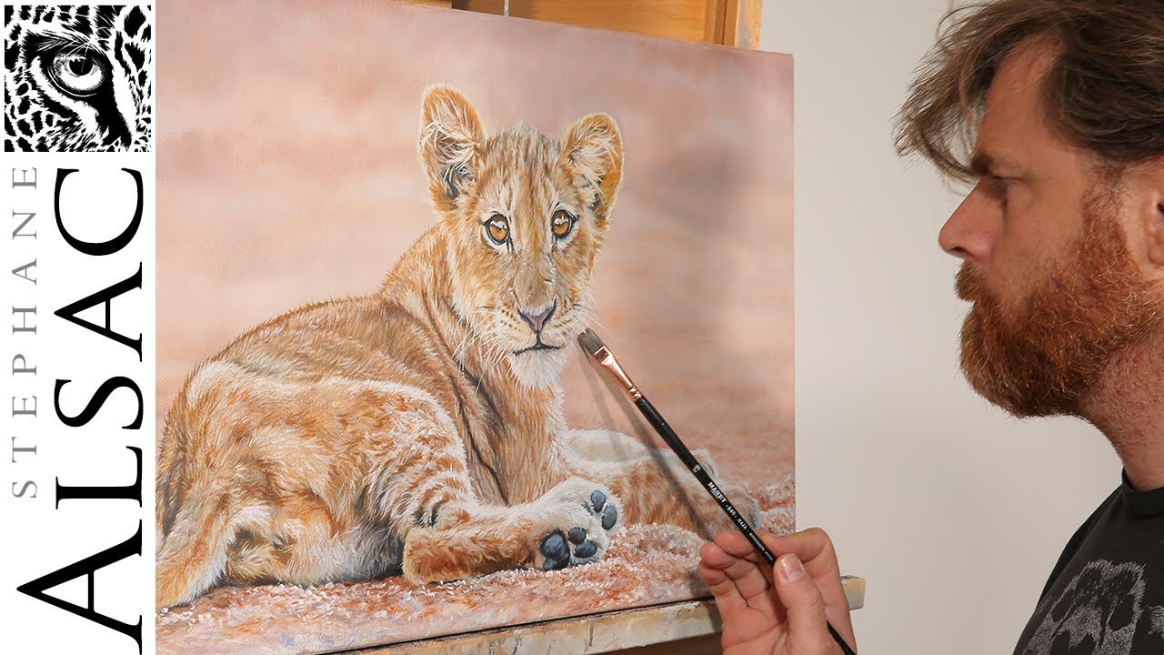 Suivez les étapes de la réalisation d'un tableau animalier réaliste à l'huile : le portrait d'un lionceau, par Stéphane Alsac, peintre animalier. Du dessin à…