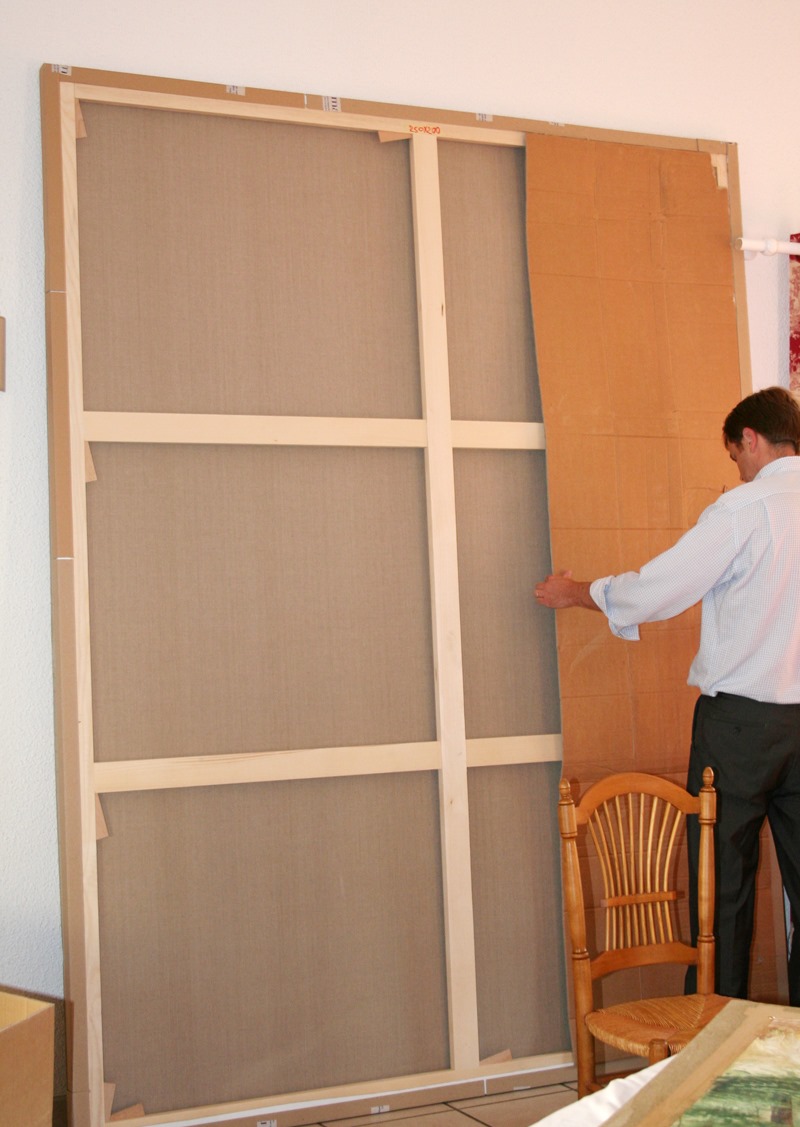 Suivant les conseils d’amis peintres, j’ai commandé le châssis chez Marin, le spécialiste du châssis, qui a pu me procurer un châssis et une toile suffisamment résistants pour supporter leur propre poids sans gondoler ou vriller : 5 semaines de délai …