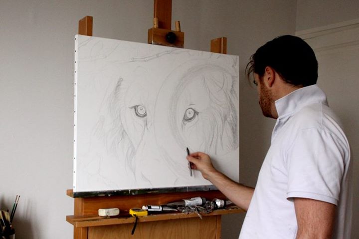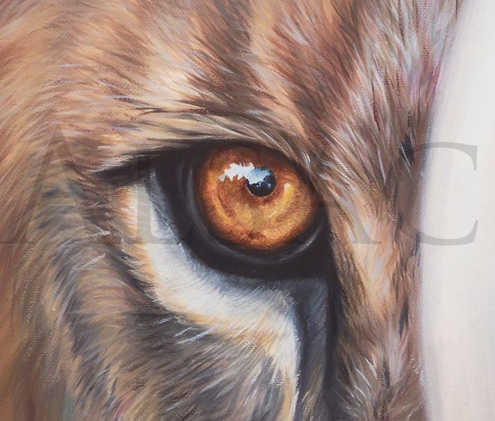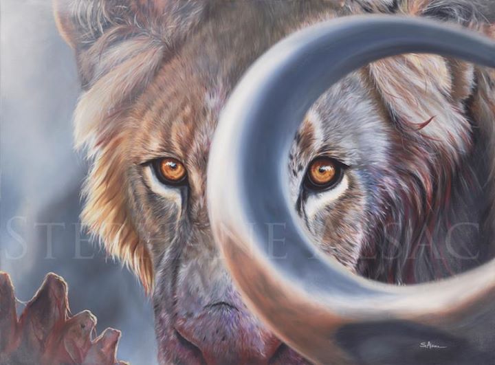 L’idée de ce tableau m’est venu en Afrique du Sud. Un matin nous avons observé 7 lions se partageant une carcasse de buffle. J’ai eu alors la vision du lion me regardant fixement à travers la corne du Buffle, l’air de dire : » Bouge pas, le prochain c’est toi ! »