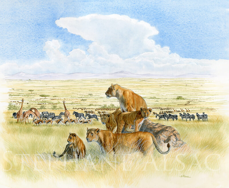 « Serengit » – peinture de lionnes et lionceaux à l’aquarelle