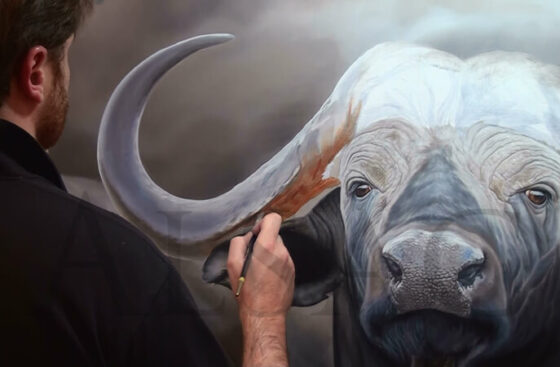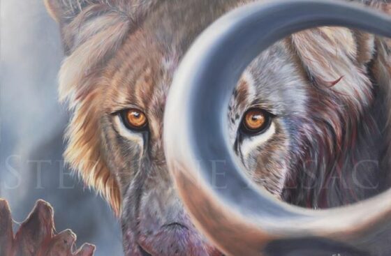 "Making of" de la peinture originale " You're Next" - 2014 Lors d'un de nos voyages en Afrique du Sud, j'ai été surpris par le regard de ce jeune lion occupé à dévorer la carcasse d'un buffle. Il m'a jeté ce regard qui semblait dire " tu es le prochain ..." Il m'a semblé intéressant de souligner ce regard en le faisant traverser la corne du buffle. J'ai flouté la corne pour avoir un effet de plans quasi-photographiques qui donnent une profondeur...