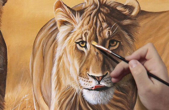 Regardez la video du making-of du tableau "The WildBunch". Stéphane Alsac, Artiste hyper-réaliste, réalise une peinture à l'huile représentant quatre lions en pleine action de chasse. La mère lionne apprend à ses trois jeunes lions à chasser. Le félins sont représentés de manière si réaliste que le spectateur a l'impression d'être leur prochaine proie. Ce tableau est une peinture à l'huile sur toile de lin d'une dimension de 150 x 70 cm.