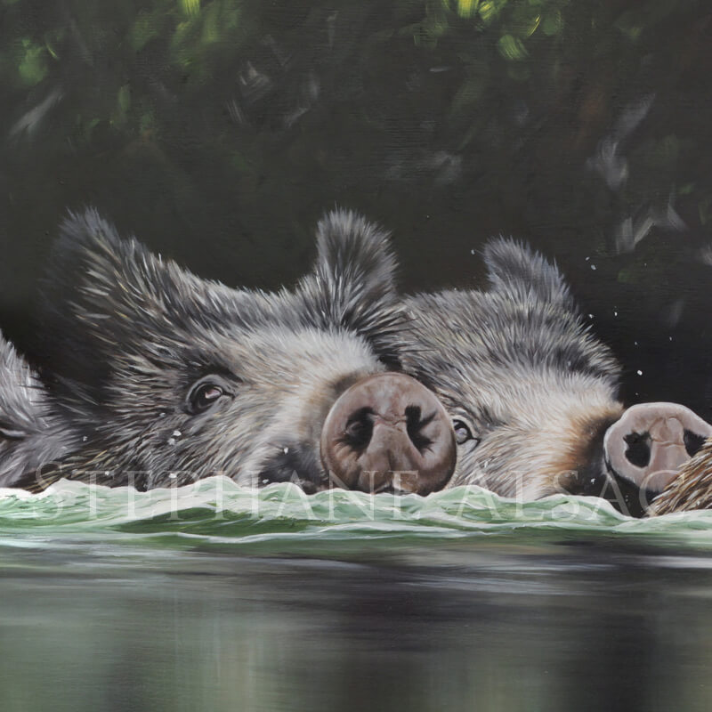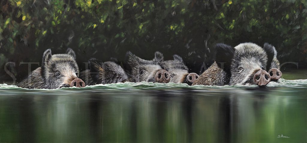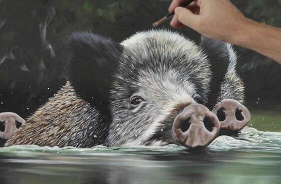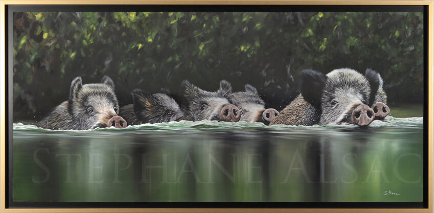 "Making of" en video du tableau"Un Pont trop loin" représentant une compagnie de sangliers traversant une rivière à la nage. Il s'agit ici d'une peinture à l'huile sur toile de lin de 1,5 mètre de long sur 70 cm de haut.