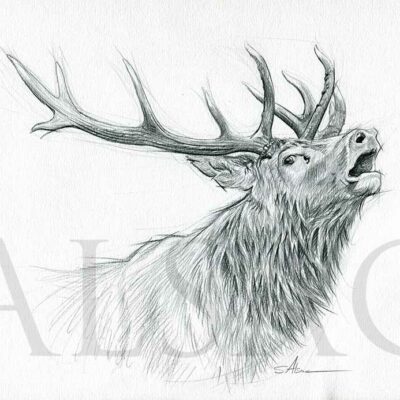 Dessin original réalisé par Stéphane Alsac, peintre animalier contemporain: Un brame de cerf à la mine graphite