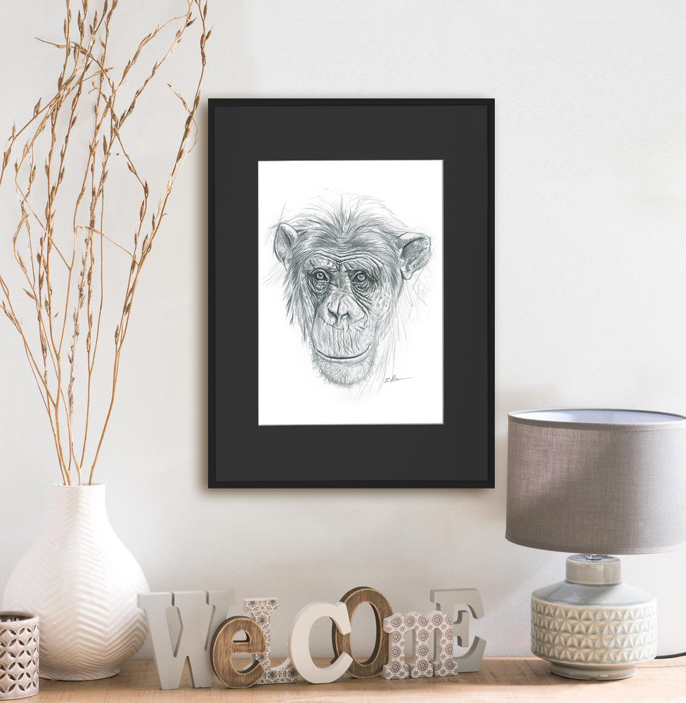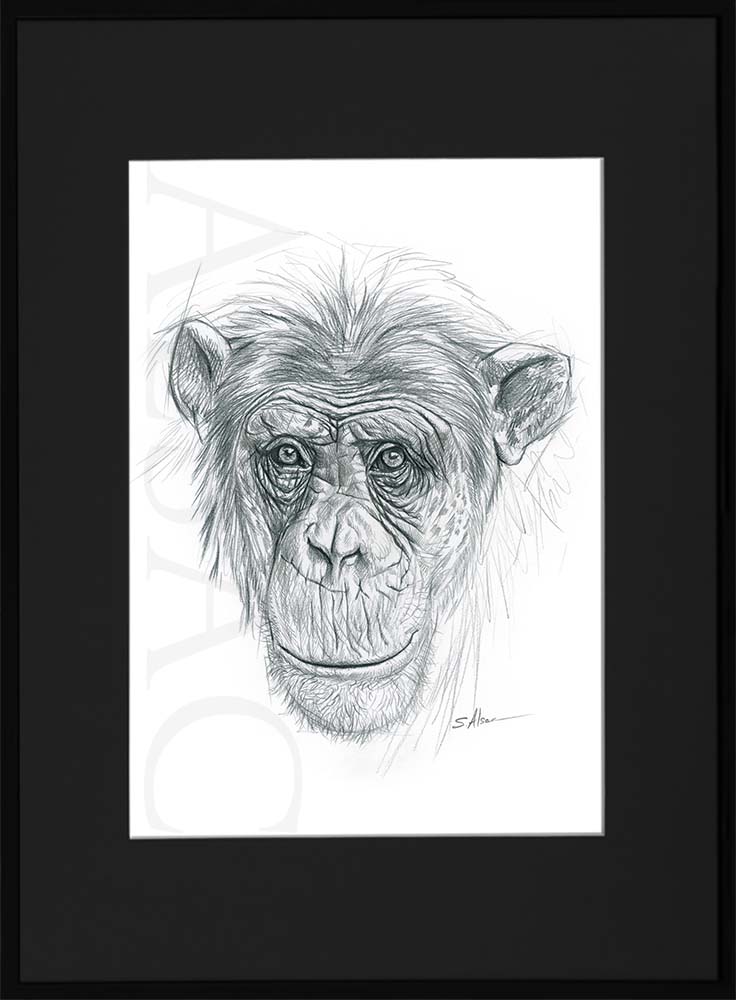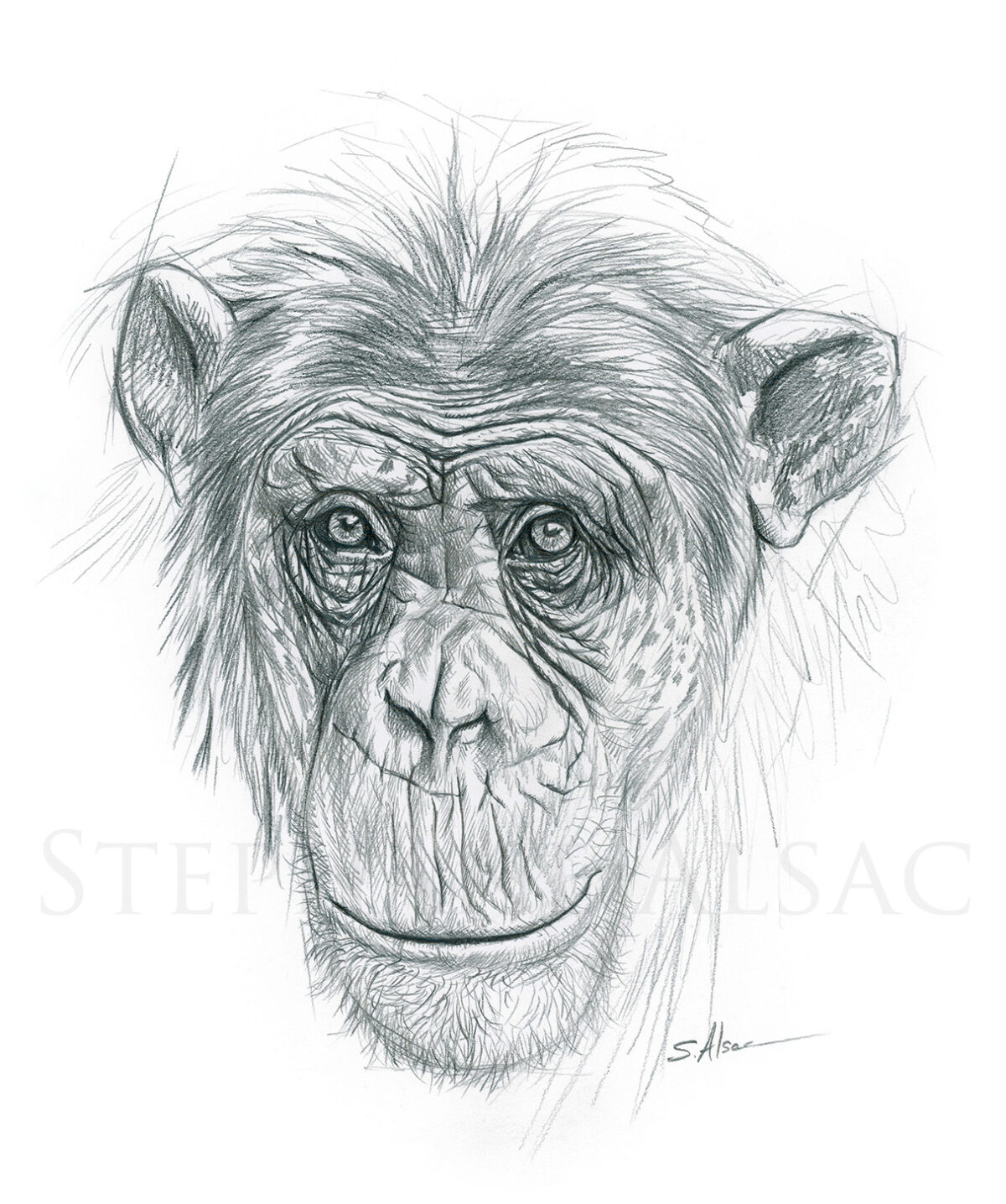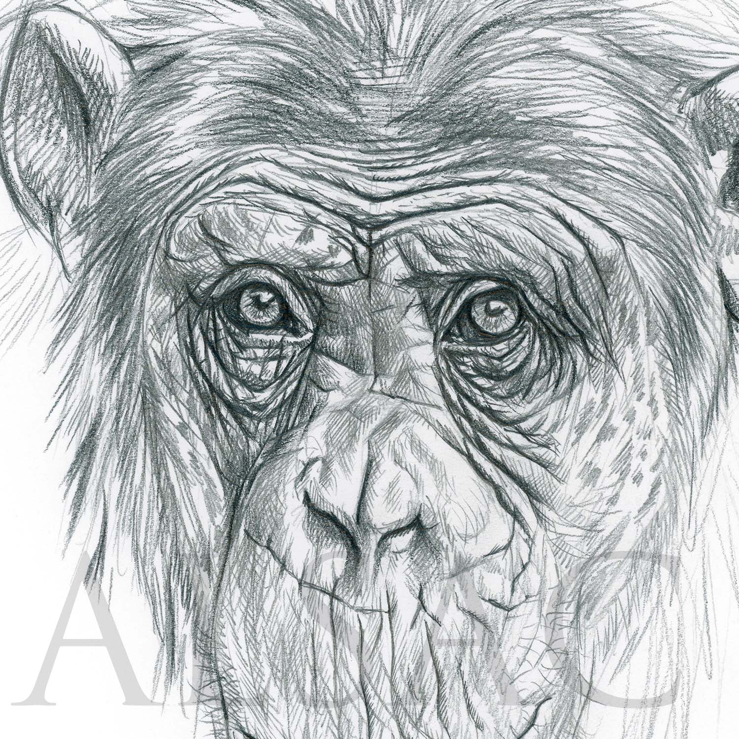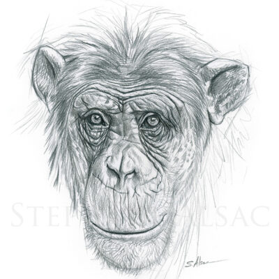 illustration originale réalisée par Stéphane Alsac, artiste animalier contemporain: Un chimpanzé réalisé à la mine de plomb