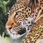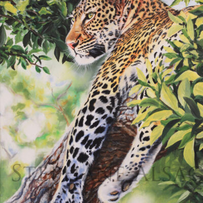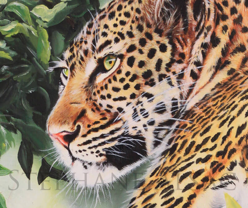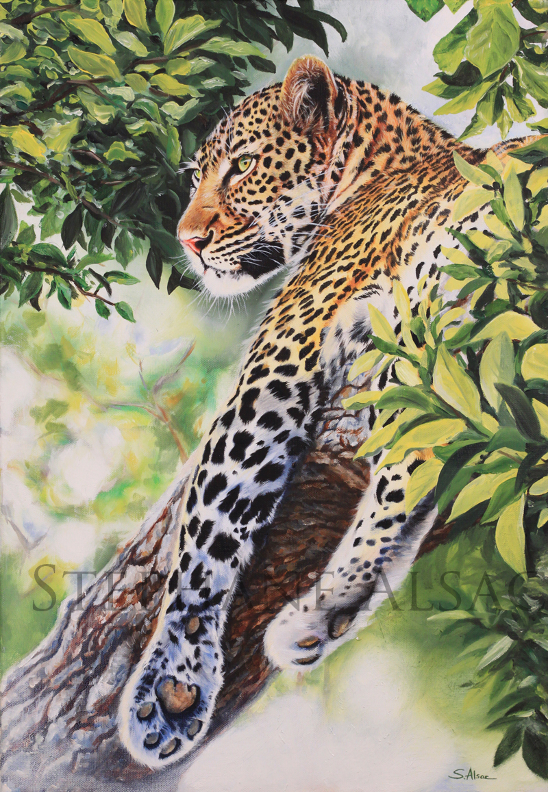 Je voulais un tableau très lumineux et frais, baigné dans une lumière de petit matin dans les tons vert et bleutés. La composition accentuée par la patte du léopard est intéressante et dynamique, néanmoins le tableau est plutôt apaisant. »