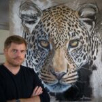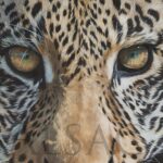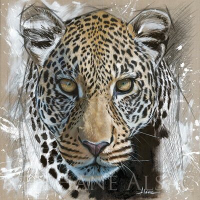 Le tableau « Leopard » fait partie de la collection « Les yeux dans les yeux » : 4 portraits carrés d’animaux sauvages peints à l’huile sur des toiles de lin brut de 1 mètre par 1 mètre.
