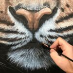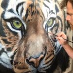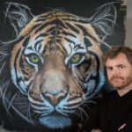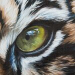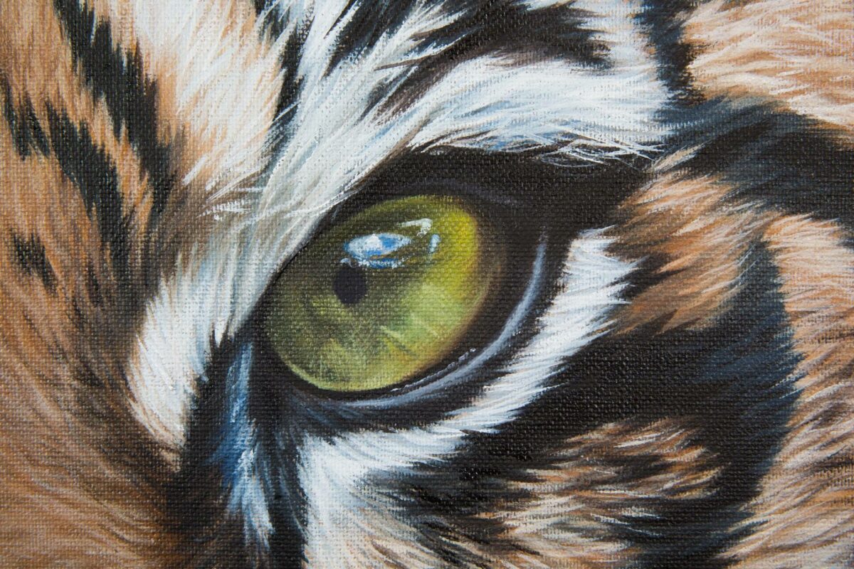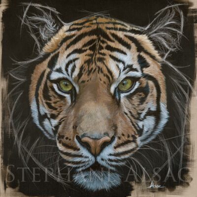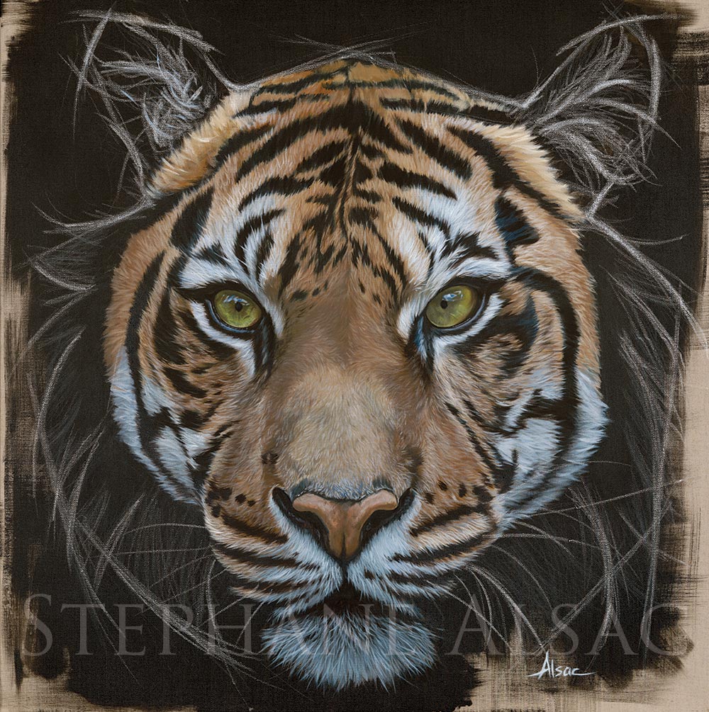 Le tableau « Tiger » fait partie de la collection « Les yeux dans les yeux » : 4 portraits carrés d’animaux sauvages peints à l’huile sur des toiles de lin brut de 1 mètre par 1 mètre.