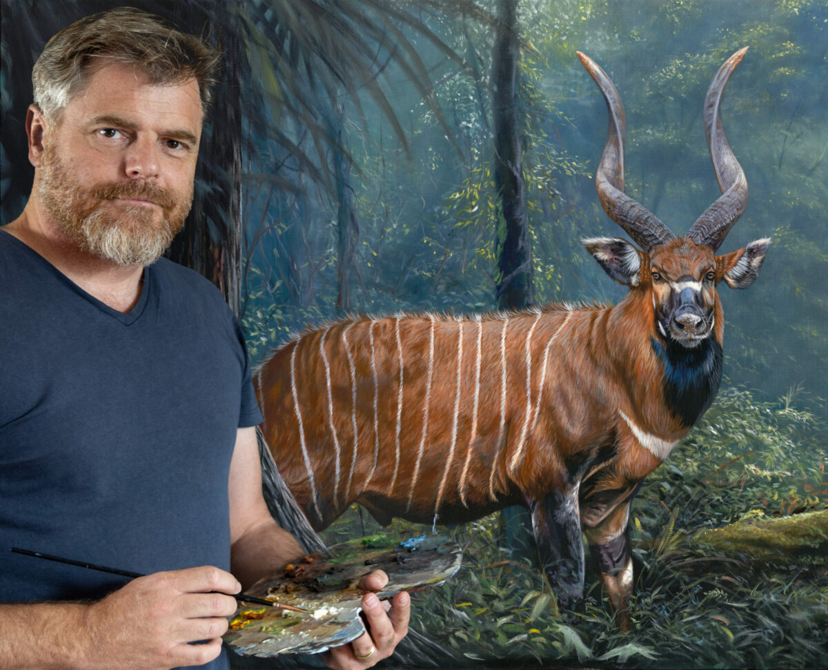 Ce que j’ai voulu transmettre dans ce tableau, c’est finalement cette expérience incroyable que j’ai vécue. Le sujet principal du tableau est finalement peu le Bongo, mais cette forêt qui vous happe, vous entraine dans son dédale de pistes crées par les éléphants. la composition dirige l’œil du spectateur, le mystère vous emporte, vous êtes dans le tableau, et le seul échappatoire est cette source de lumière.