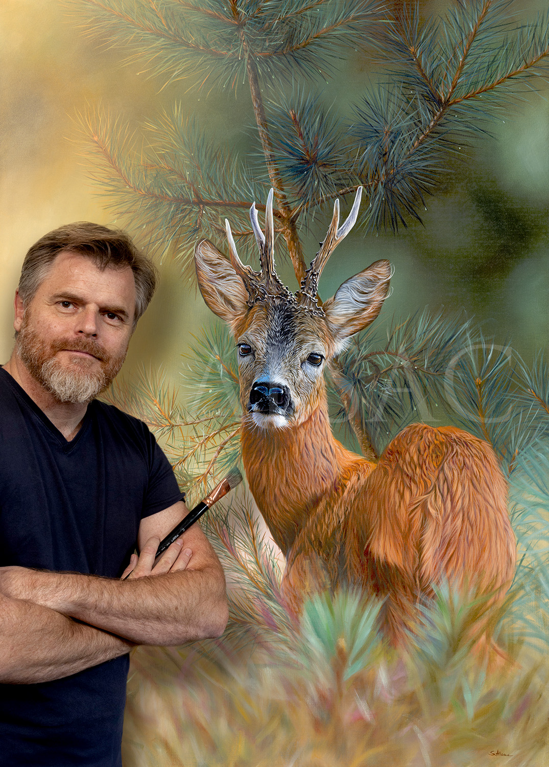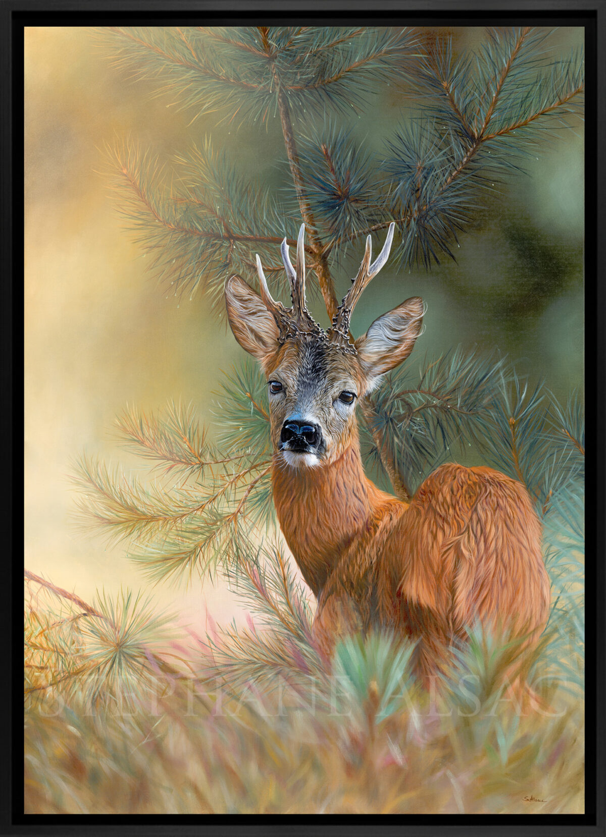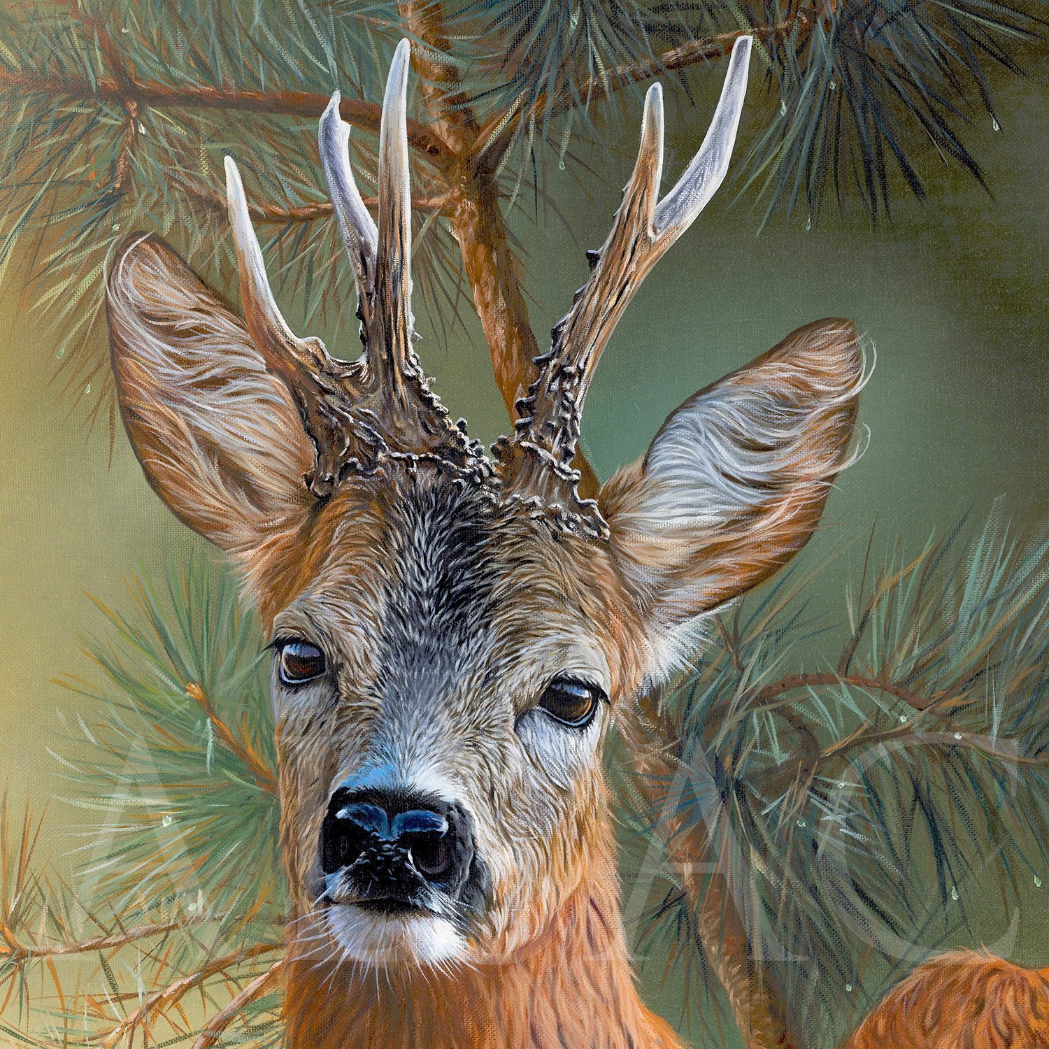 Ce tableau est un peu spécial pour moi dans la mesure où j’ai une fascination aussi grande qu’inexplicable pour le chevreuil. Il me semble que cet animal est de ces êtres qui ont été façonnés directement par le divin : son élégance, sa posture, son port de tête, son trophée, tout en lui force l’admiration. C’est comme une mélodie sans fausse note.
