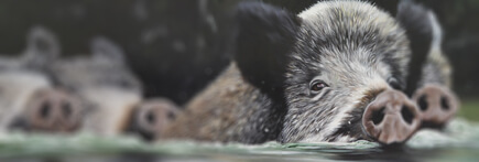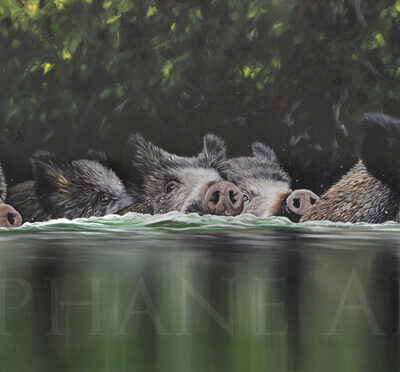 Peinture de sangliers traversant une rivière par Stéphane Alsac.
