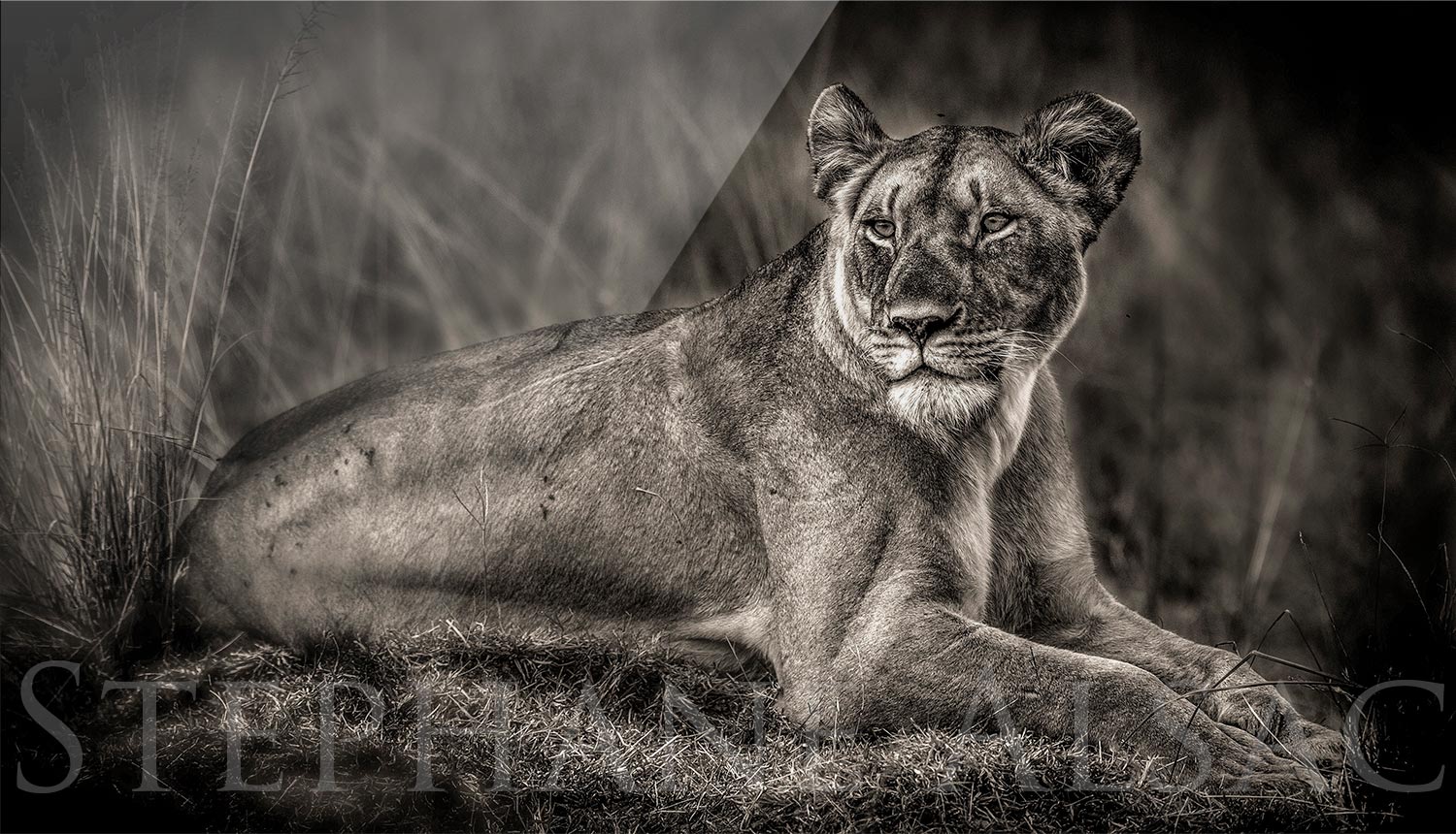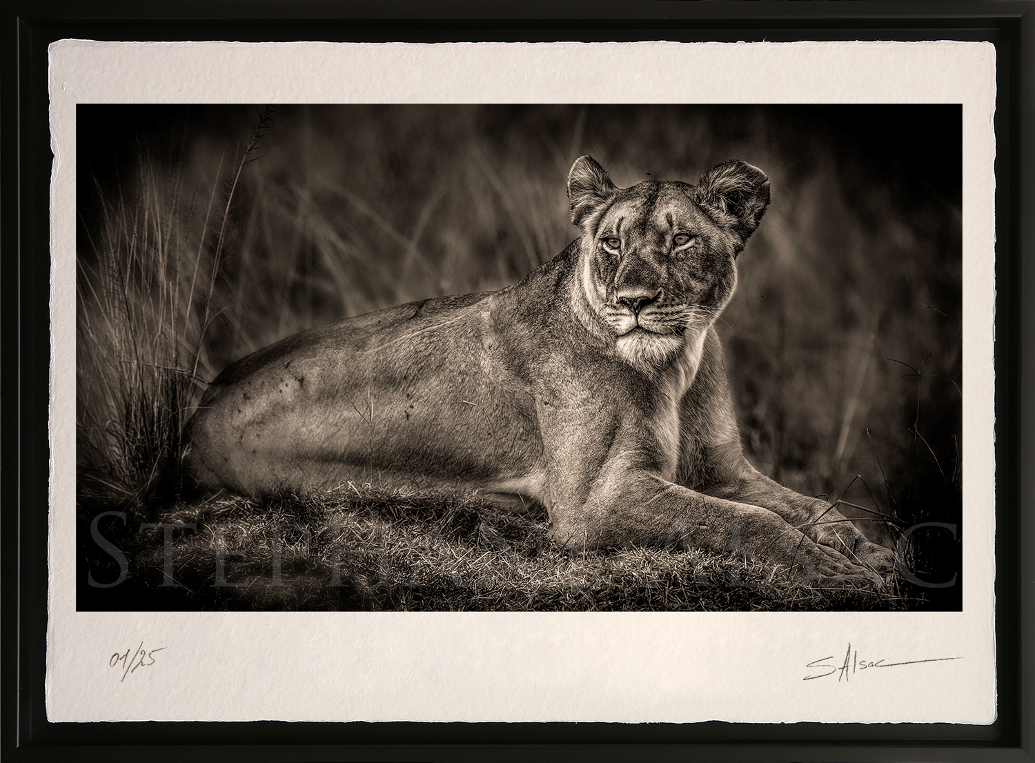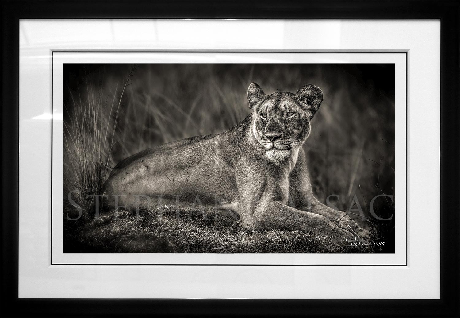 « Wild Beauty » est une série de Photographies d’Art Noir et Blanc de l’Artiste Animalier Stéphane Alsac, connu pour ses tableaux d’animaux d’un réalisme saisissant. L’intention artistique de cette collection de photos monochromes est de créer un dialogue entre l’animal sauvage africain et le spectateur. La photo noir et blanc fait ressortir les formes et les textures des animaux d’Afrique et souligne ainsi la force brute de l’animal et sa beauté sauvage. Stéphane Alsac vous invite à plonger vos yeux dans ceux du Lion, de toucher la texture de la trompe de l’Eléphant, de sentir le feulement du léopard à travers ces photos artistiques noir et blanc et sépias. L’ambiance de la savane africaine vous emporte dans un safari photo magique. Les tirages photographiques originaux sont limités à 25 exemplaires. La photo est signée par le photographe animalier et numérotée. Choisissez la taille et l’aspect de votre photo :