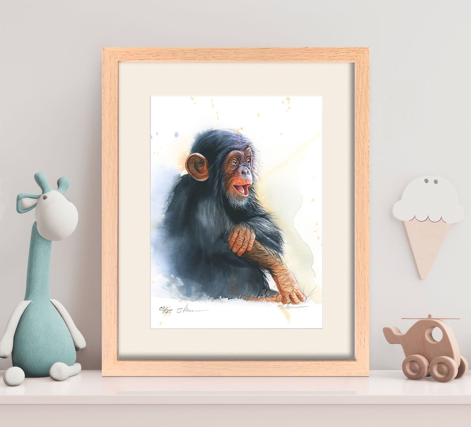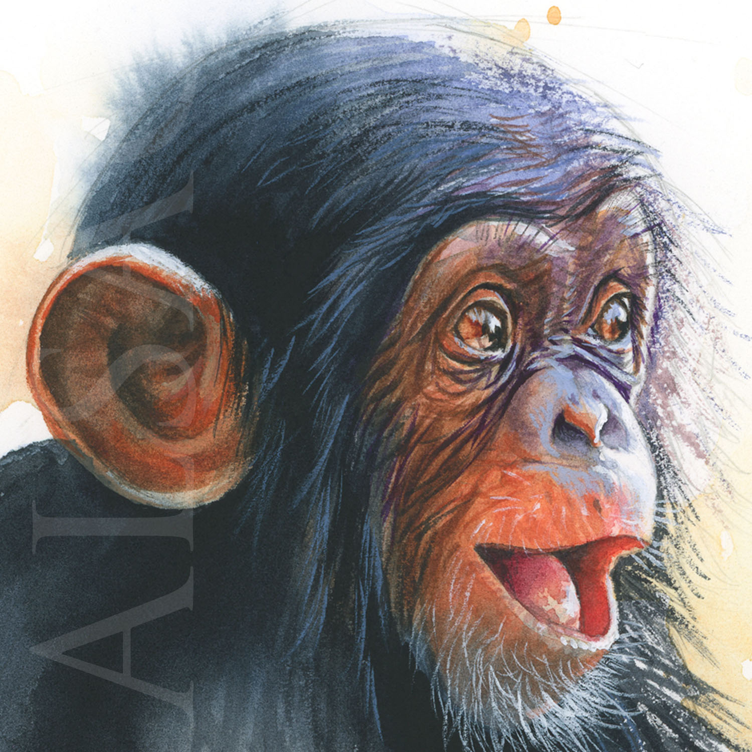 Dessin à l’aquarelle original réalisée par Stéphane Alsac, artiste animalier contemporain: Un bébé chimpanzé.