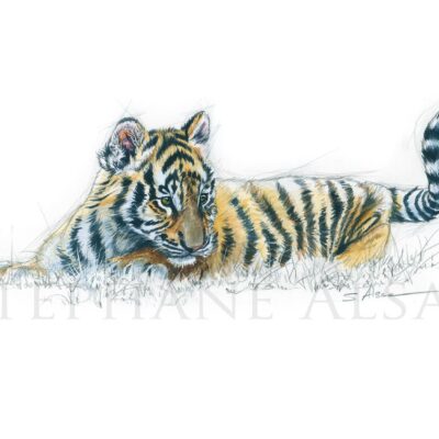 Illustration originale à l’aquarelle réalisée par Stéphane Alsac, artiste animalier contemporain: Un bébé Tigre de Sumatra réalisé à la mine de plomb et rehaussé à l’aquarelle.