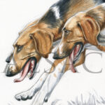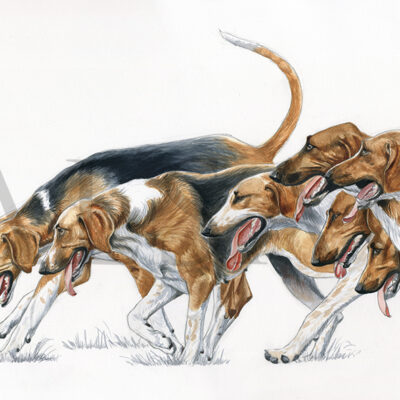 « Bien Ameutés ! » est une aquarelle de Stéphane Alsac, Artiste peintre animalier, représentant une meute de chiens de Venerie bien ameutée, c’est à dire en état de bien chasser ensemble.