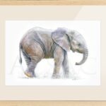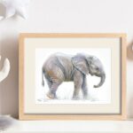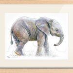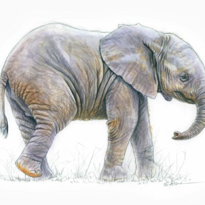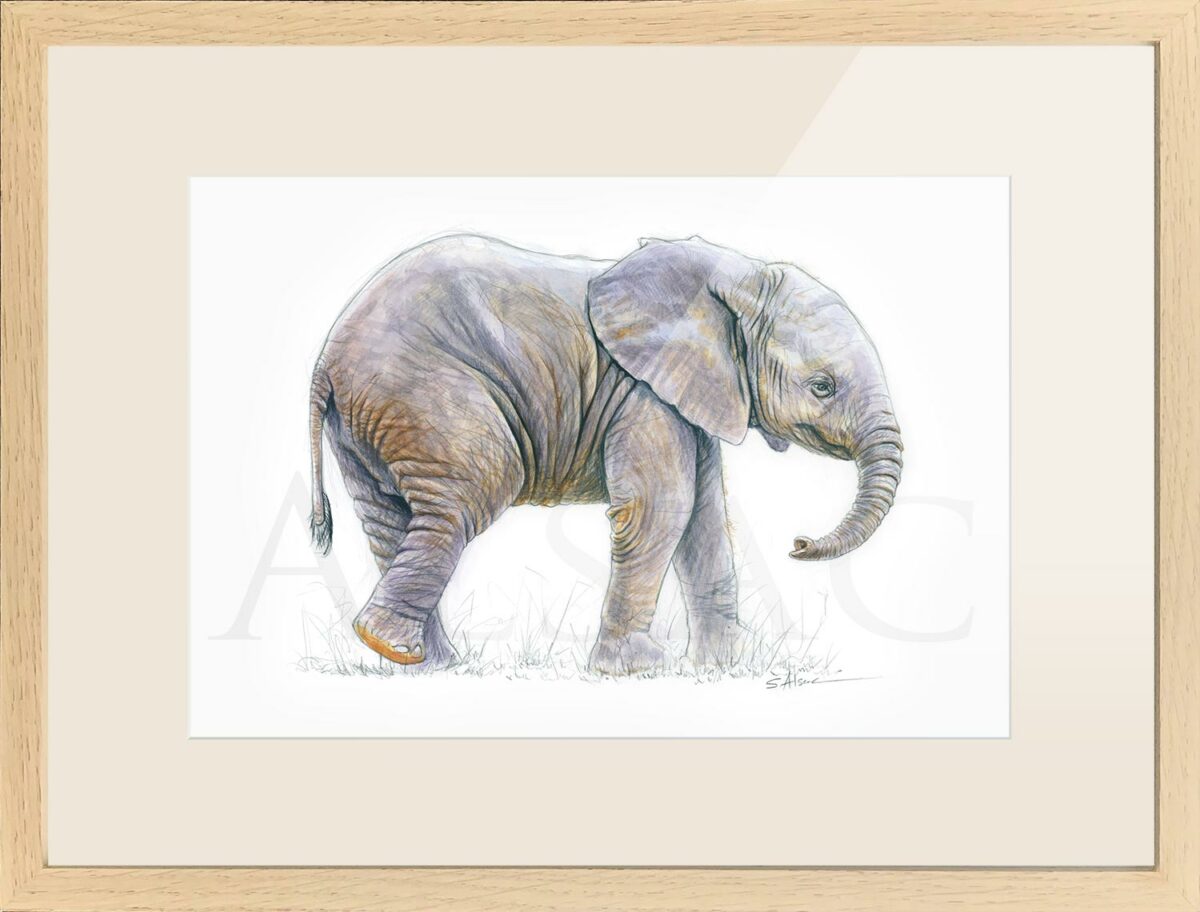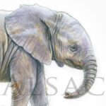 Illustration originale à l’aquarelle réalisée par Stéphane Alsac, artiste animalier contemporain: Un bébé Éléphant réalisé à la mine de plomb et rehaussé à l’aquarelle.
