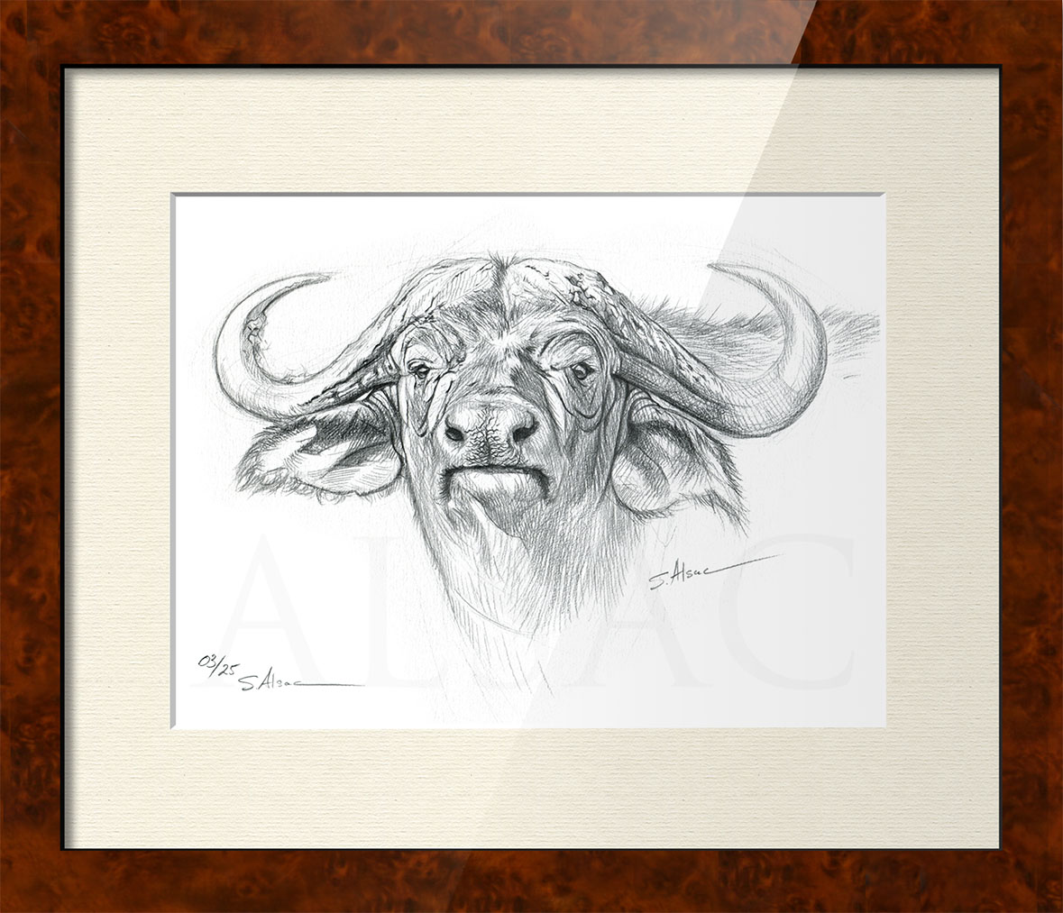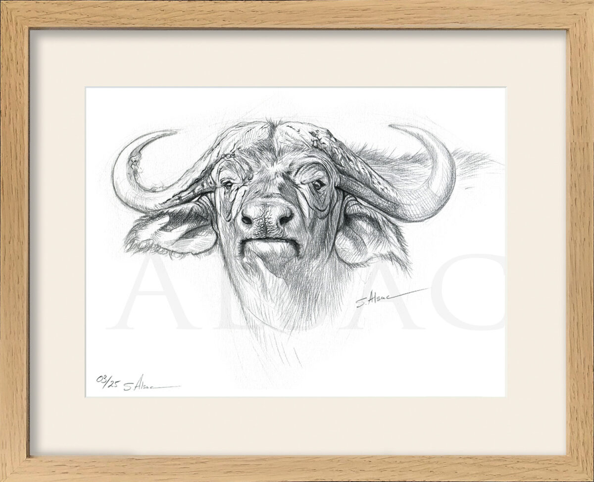 illustration originale réalisée par Stéphane Alsac, artiste animalier contemporain: Un Buffle Caffer d’Afrique réalisé à la mine de plomb