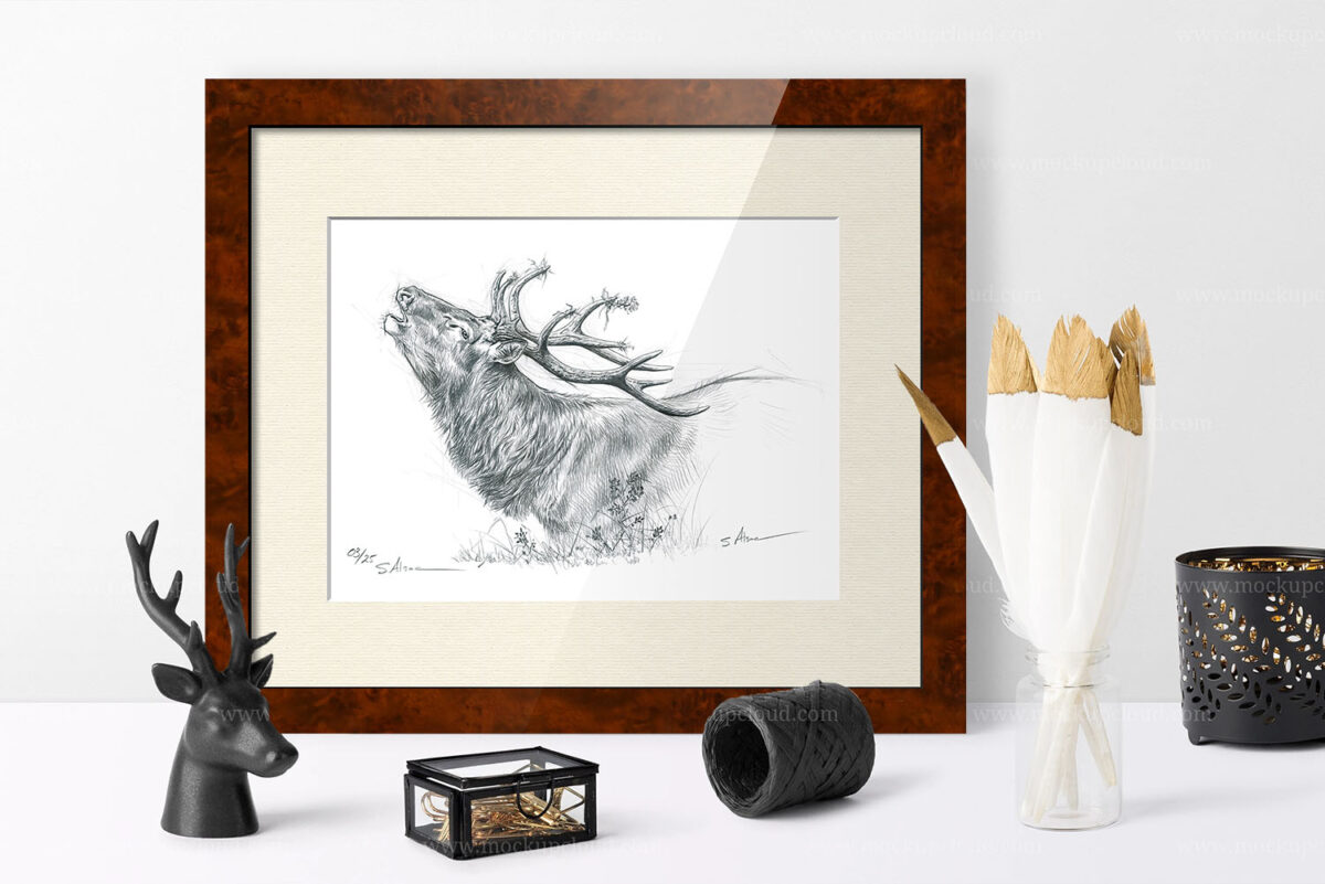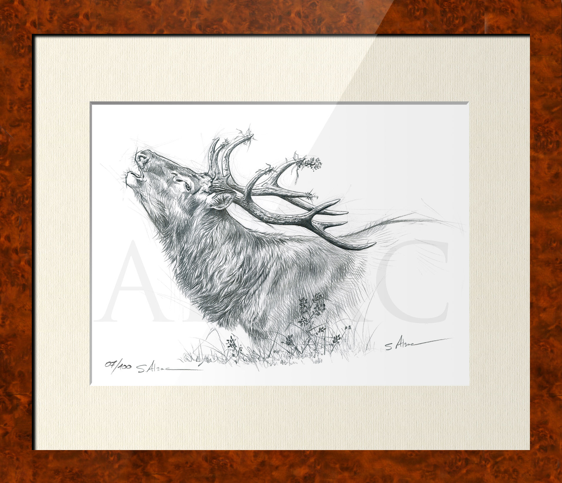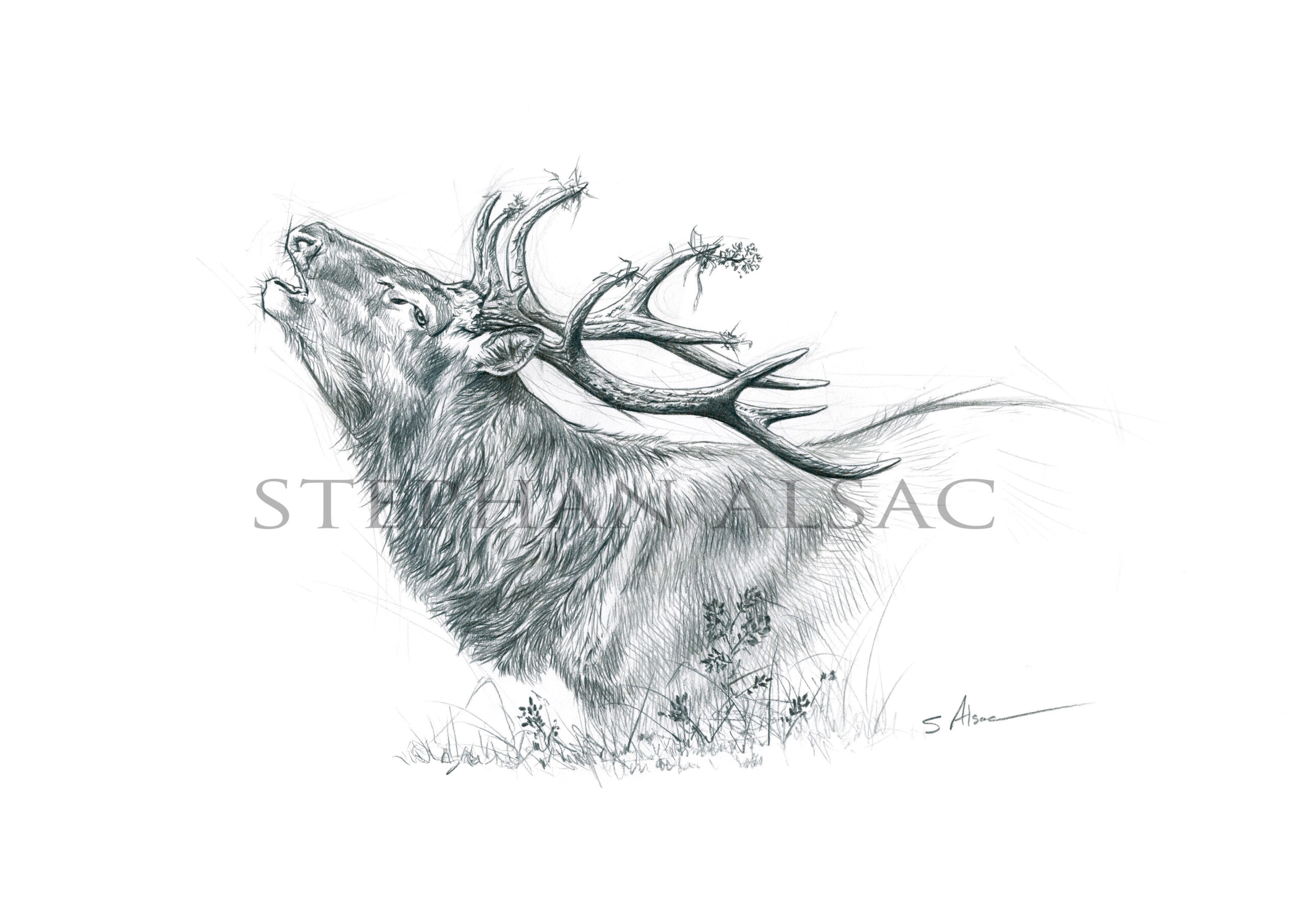 Illustration naturaliste originale réalisée par Stéphane Alsac, artiste animalier contemporain: Un cerf elaphe européen au brame