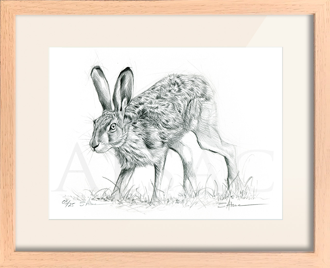 « lièvre à l’arrêt » est un dessin réalisé à la mine de plomb représentant un lièvre. Un dessin animalier contemporain signé par l’Artiste et encadrée et une idée de cadeau pour un ami chasseur.