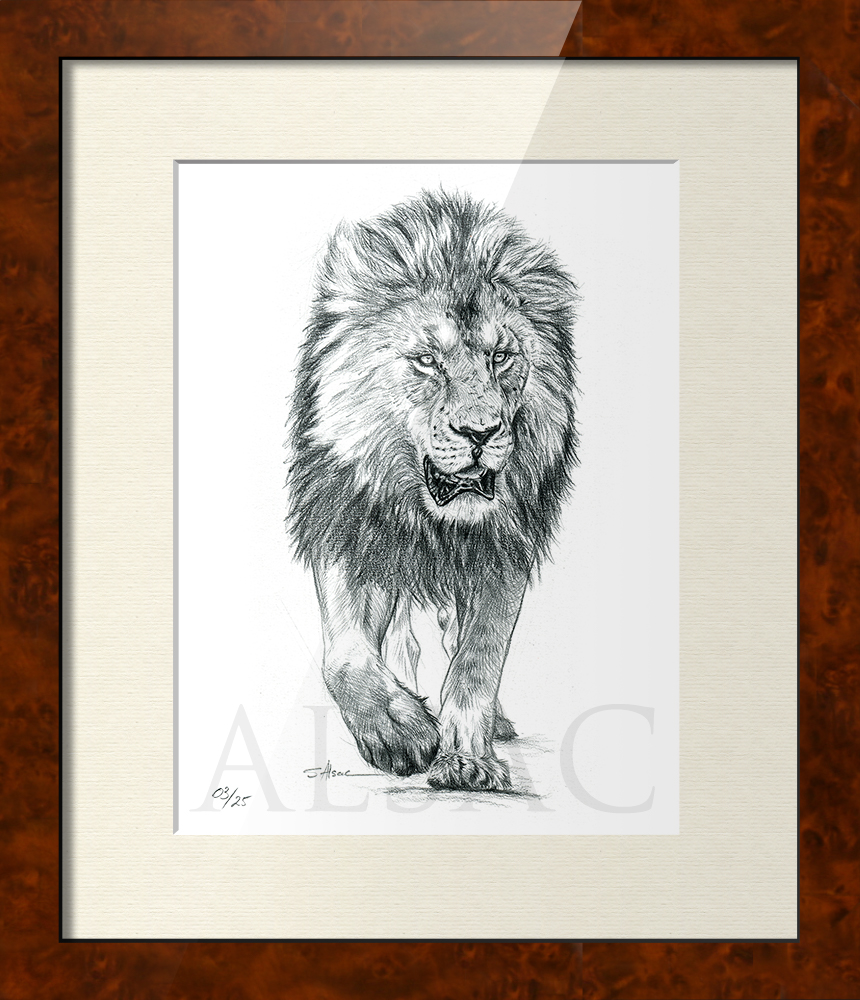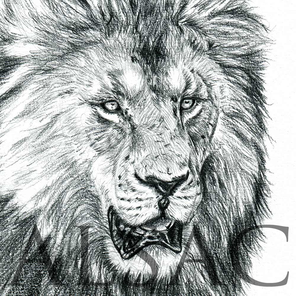 Reproduction en édition limitée d’un dessin original réalisé par Stéphane Alsac, artiste peintre animalier contemporain : le portrait d’un lion du Masai Mara au Kenya en dessin à la mine de plomb.