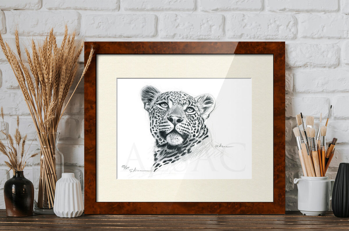 Illustration originale réalisée par Stéphane Alsac, artiste animalier : le portrait d’une panthère réalisée à la mine de plomb.