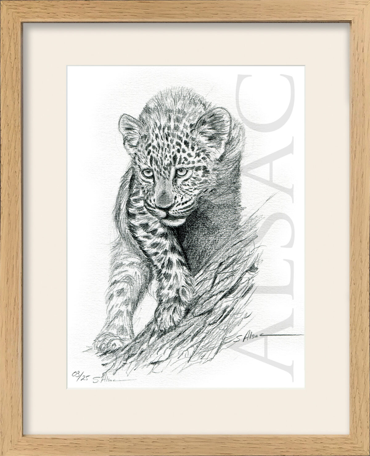 Lithographie digitale sur papier du dessin original réalisé par Stéphane Alsac, artiste animalier contemporain: l’illustration d’un jeune leopard.