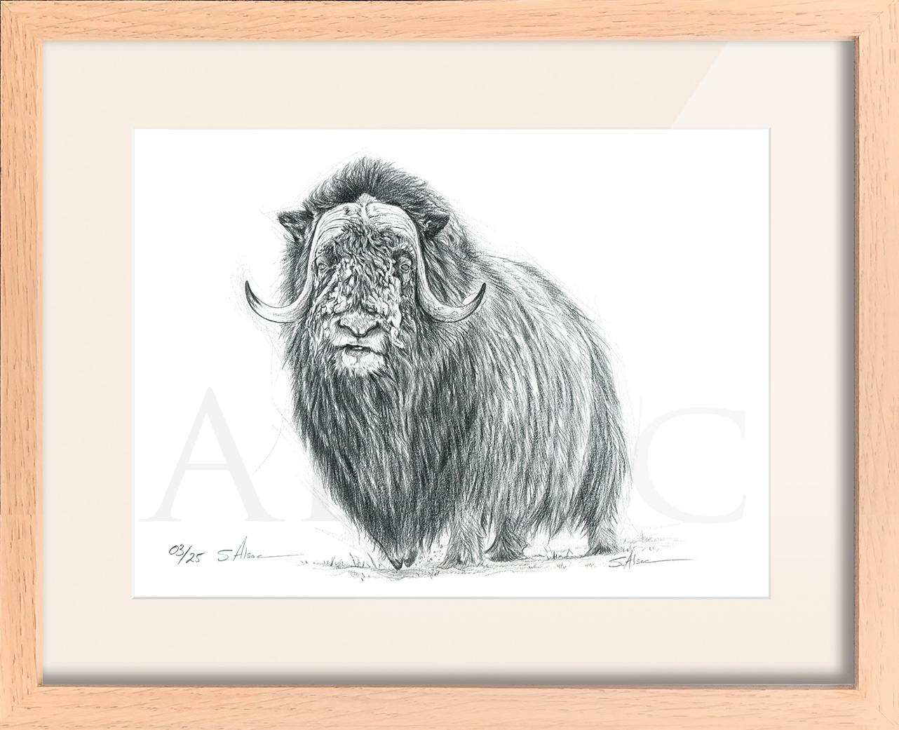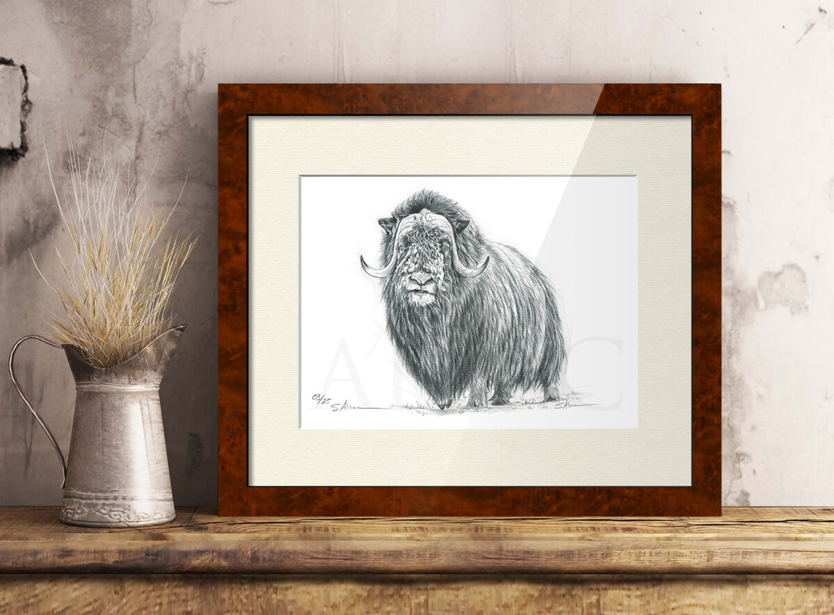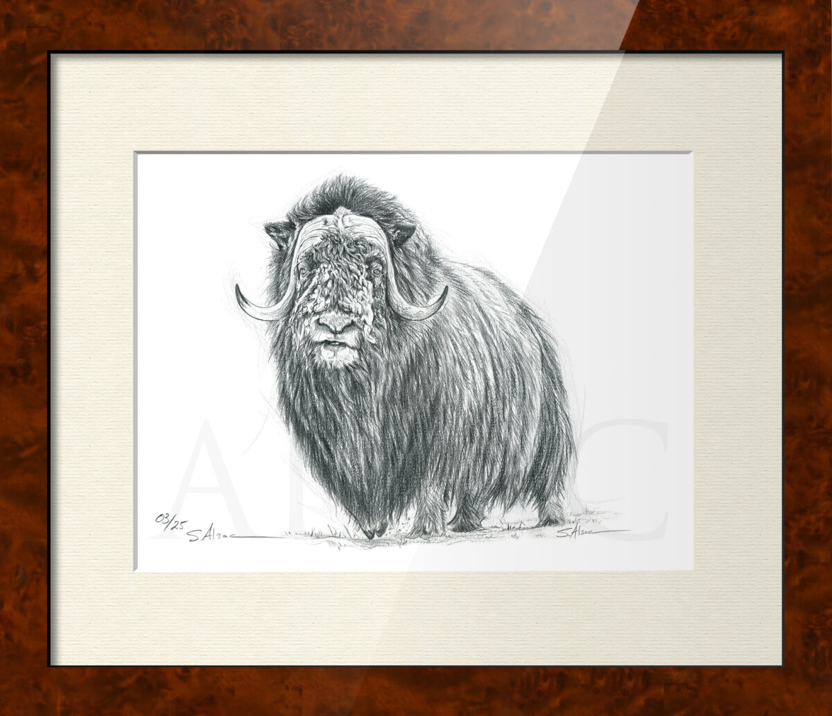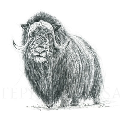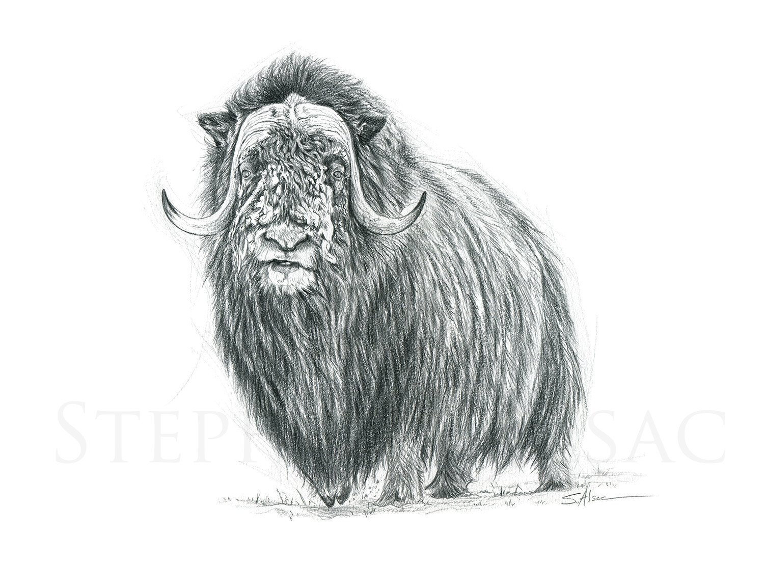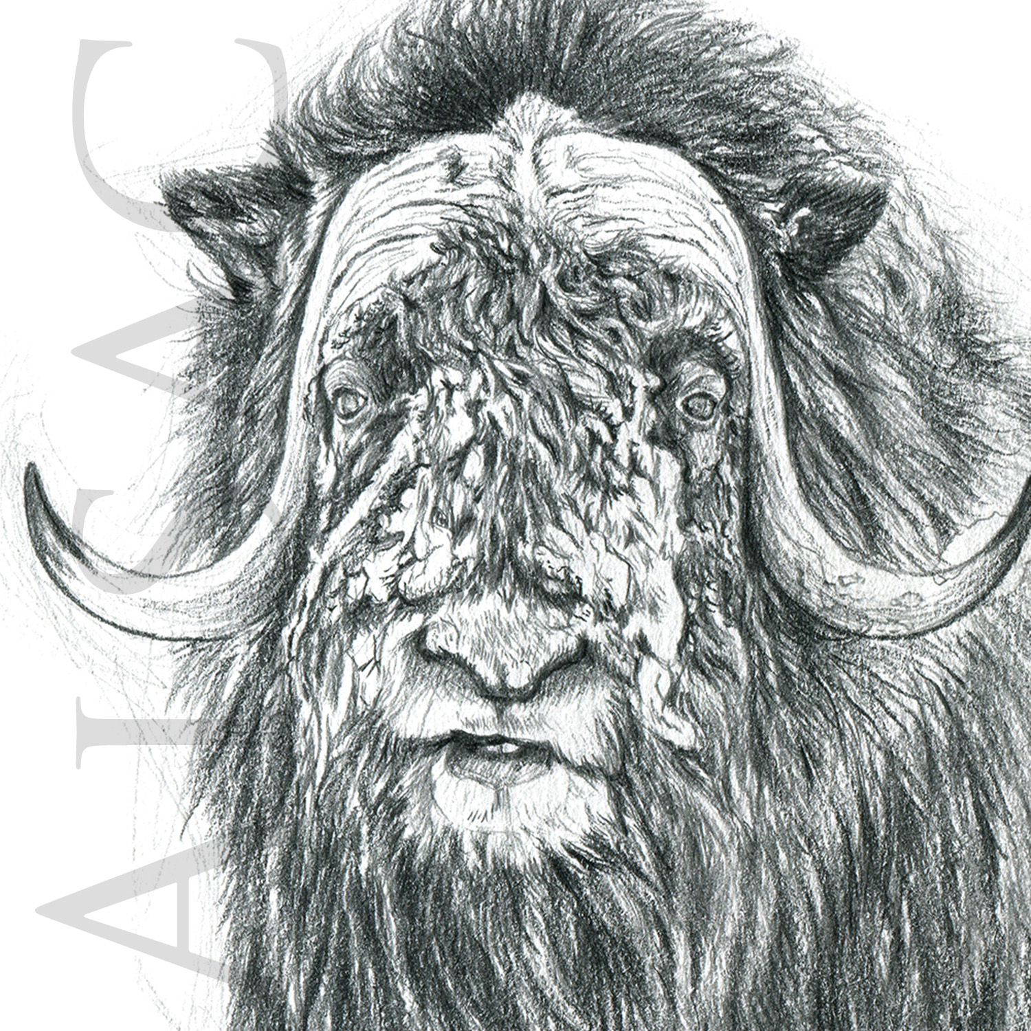 Illustration originale réalisée par Stéphane Alsac, artiste animalier : le dessin d’un Boeuf musqué réalisé à la mine de plomb.
