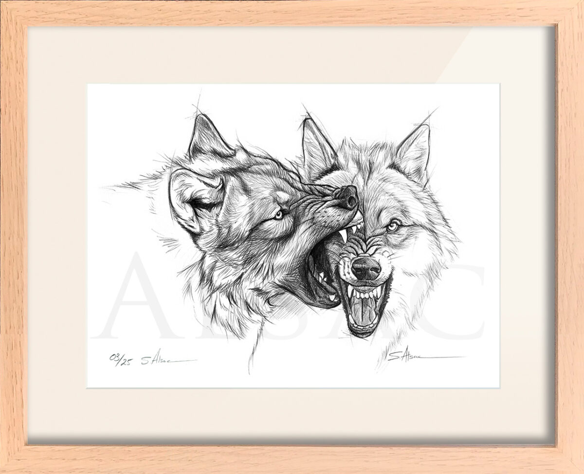 Illustration originale réalisée par Stéphane Alsac, artiste animalier moderne : Un combat de loups en dessin au stylo bic.