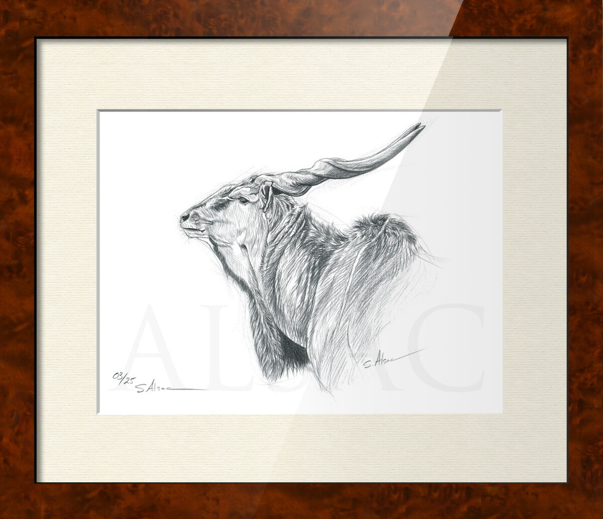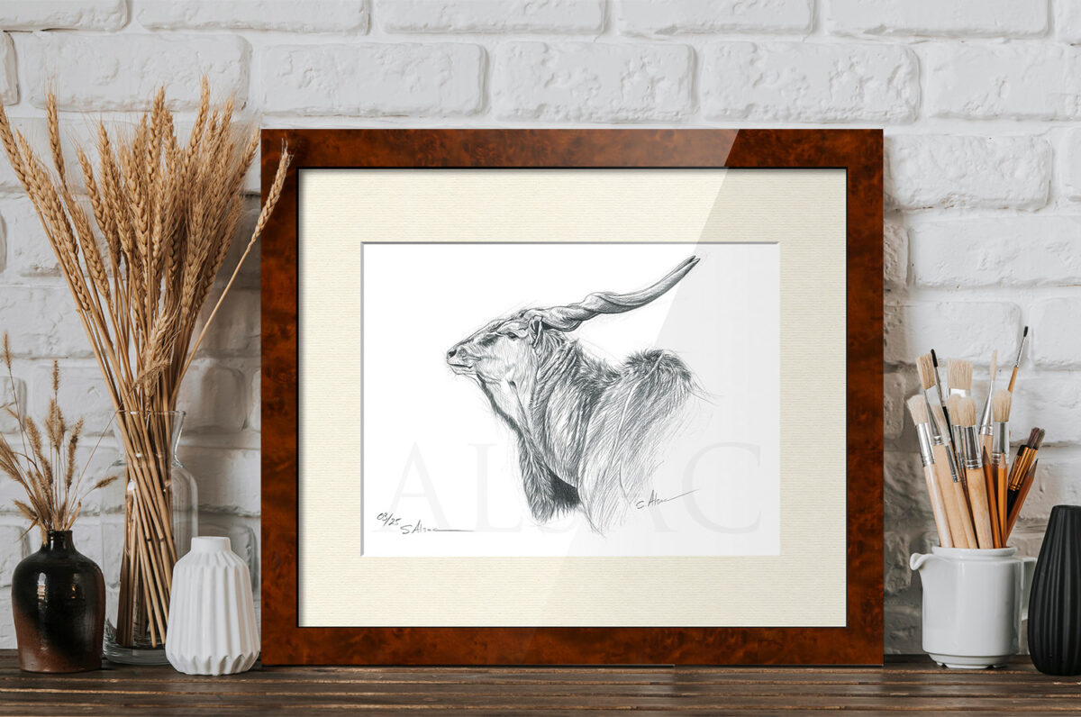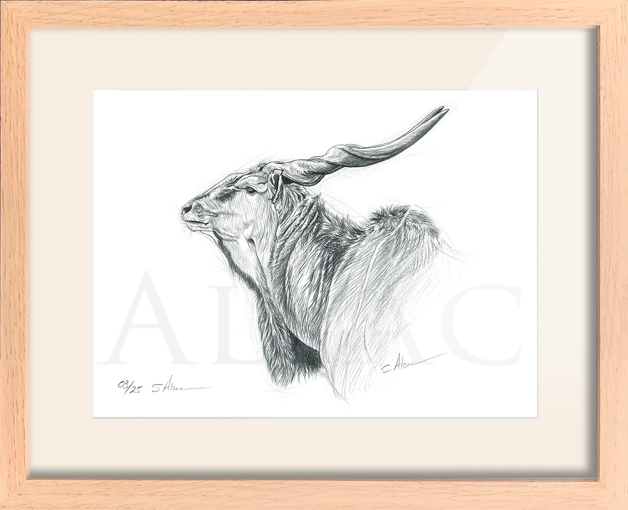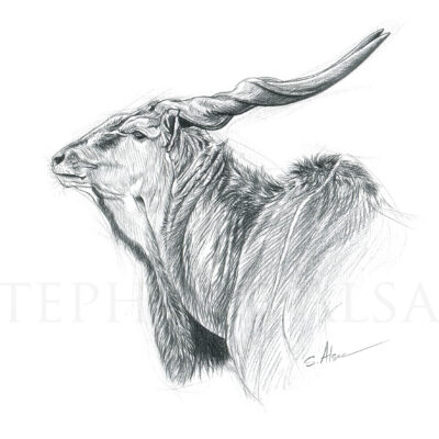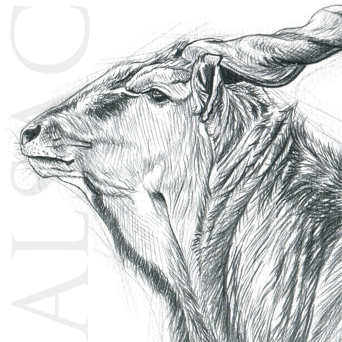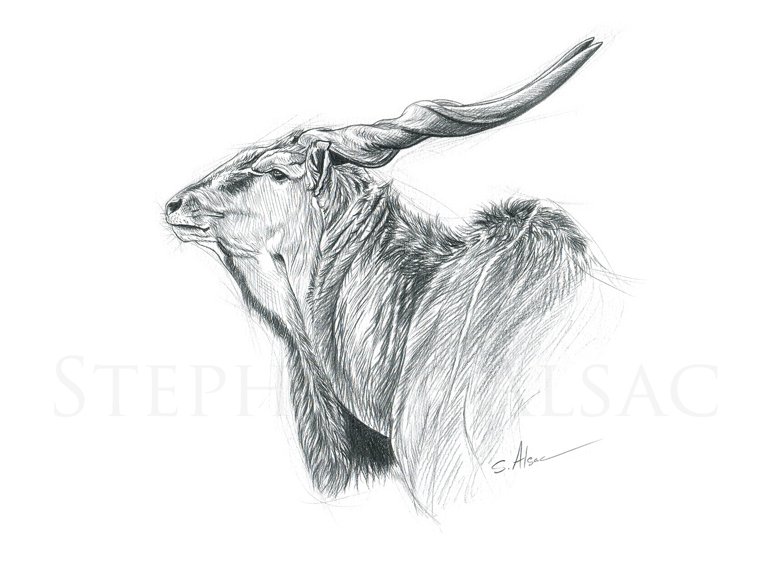 Illustration originale réalisée par Stéphane Alsac, artiste animalier : le dessin d’un Eland de Derby réalisé à la mine de plomb.