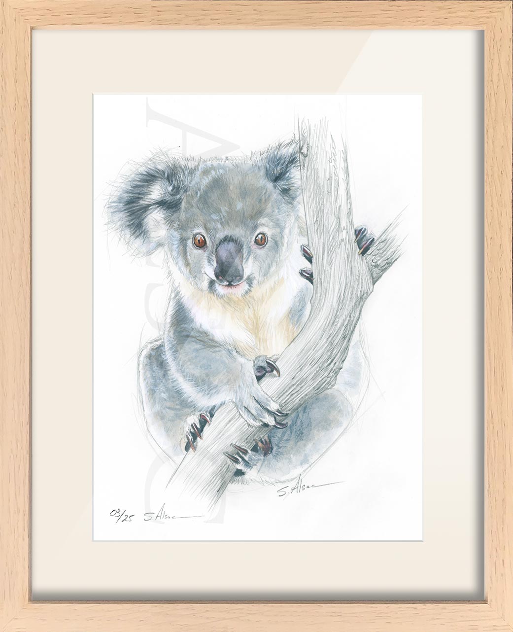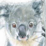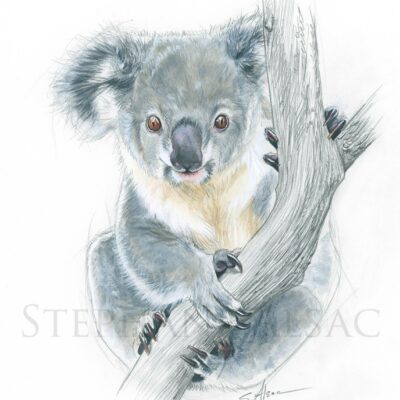 Illustration originale à l’aquarelle réalisée par Stéphane Alsac, artiste animalier contemporain: Un bébé koala réalisé à la mine de plomb et rehaussé à l’aquarelle.