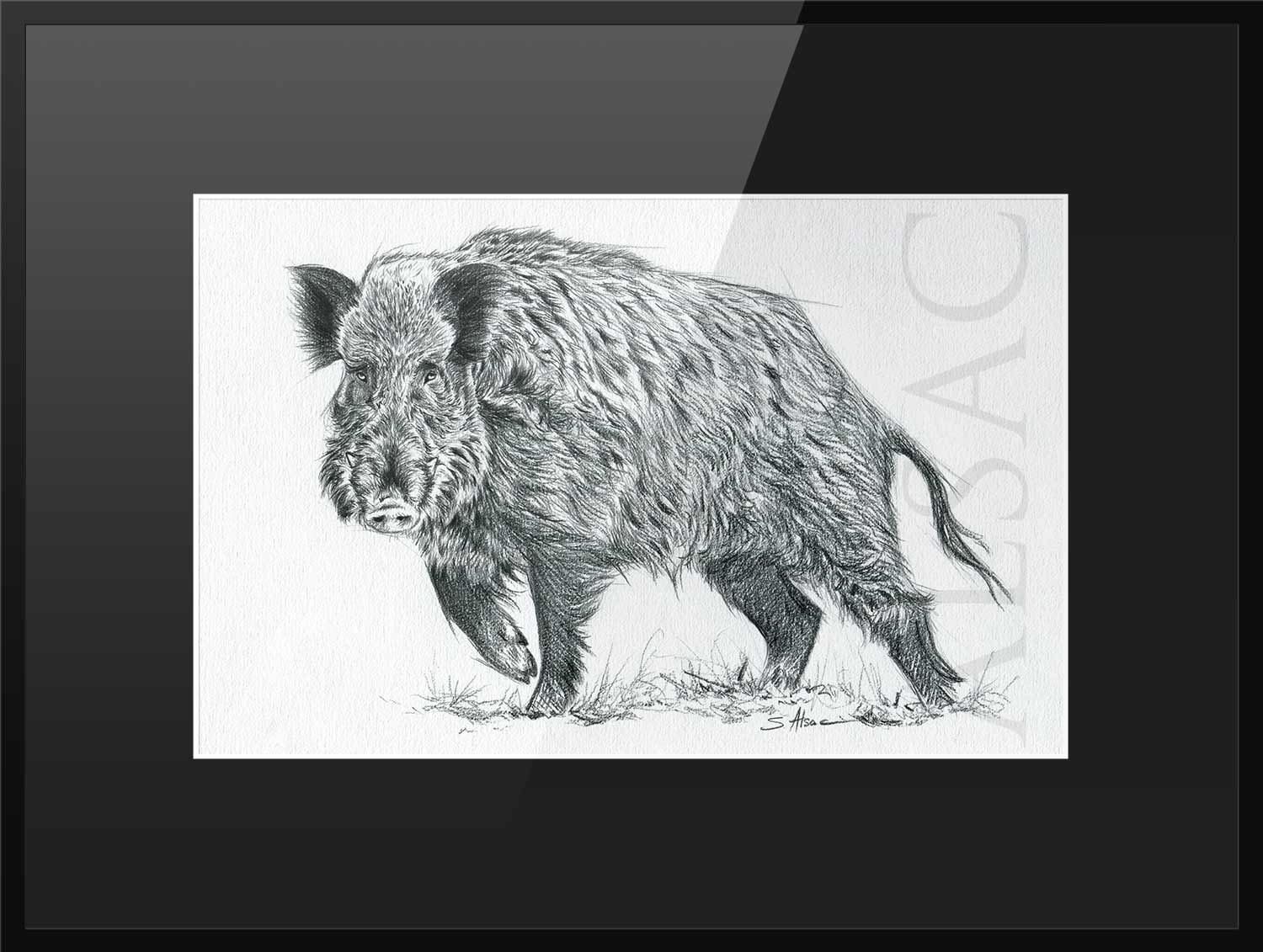 Illustration animalière originale réalisée par Stéphane Alsac, artiste animalier contemporain: Un sanglier en dessin à la mine de plomb.