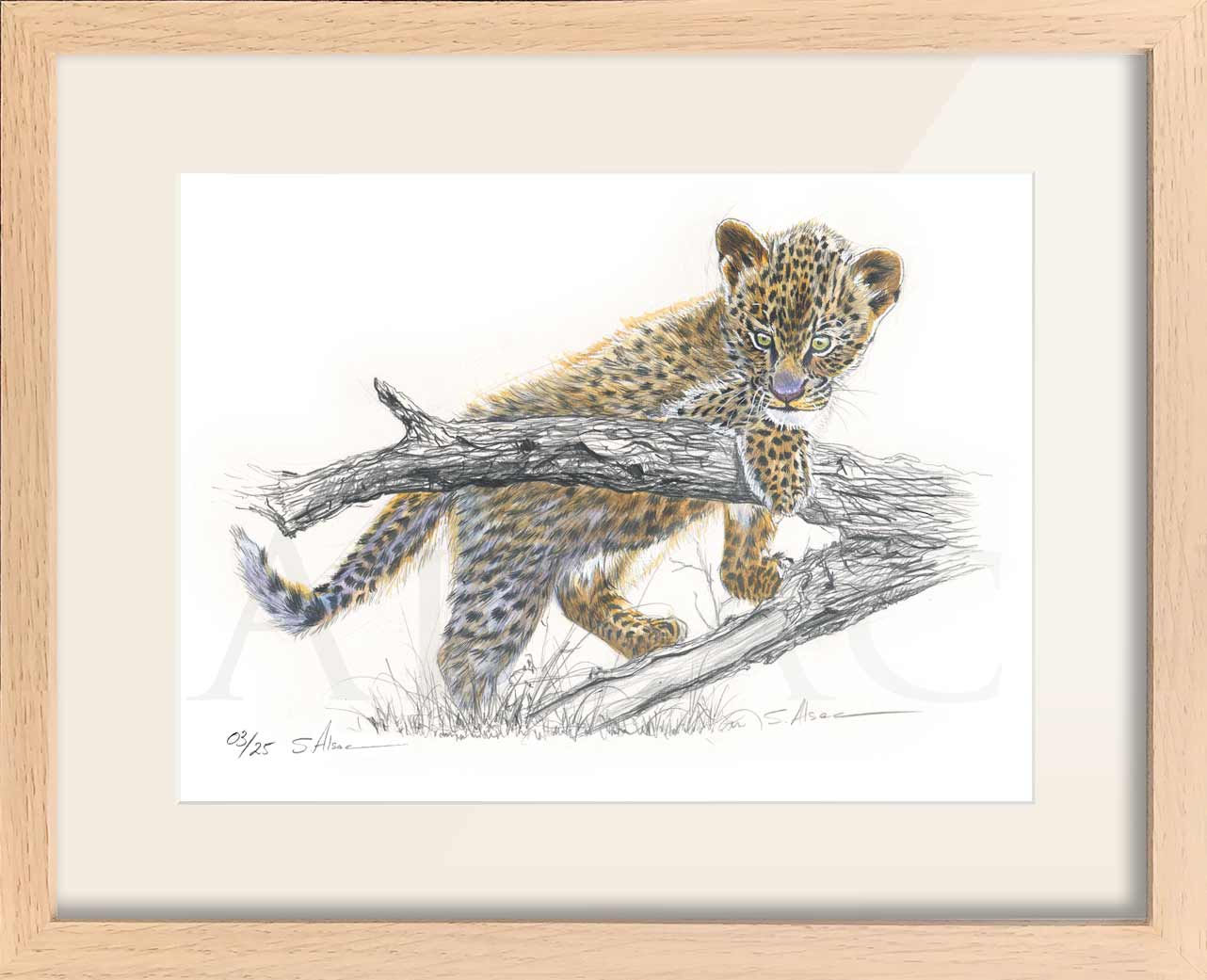 Dessin à l’aquarelle original réalisée par Stéphane Alsac, artiste animalier contemporain: Un très jeune léopard.