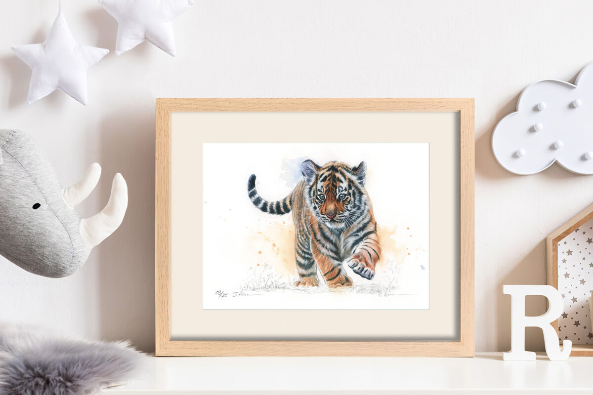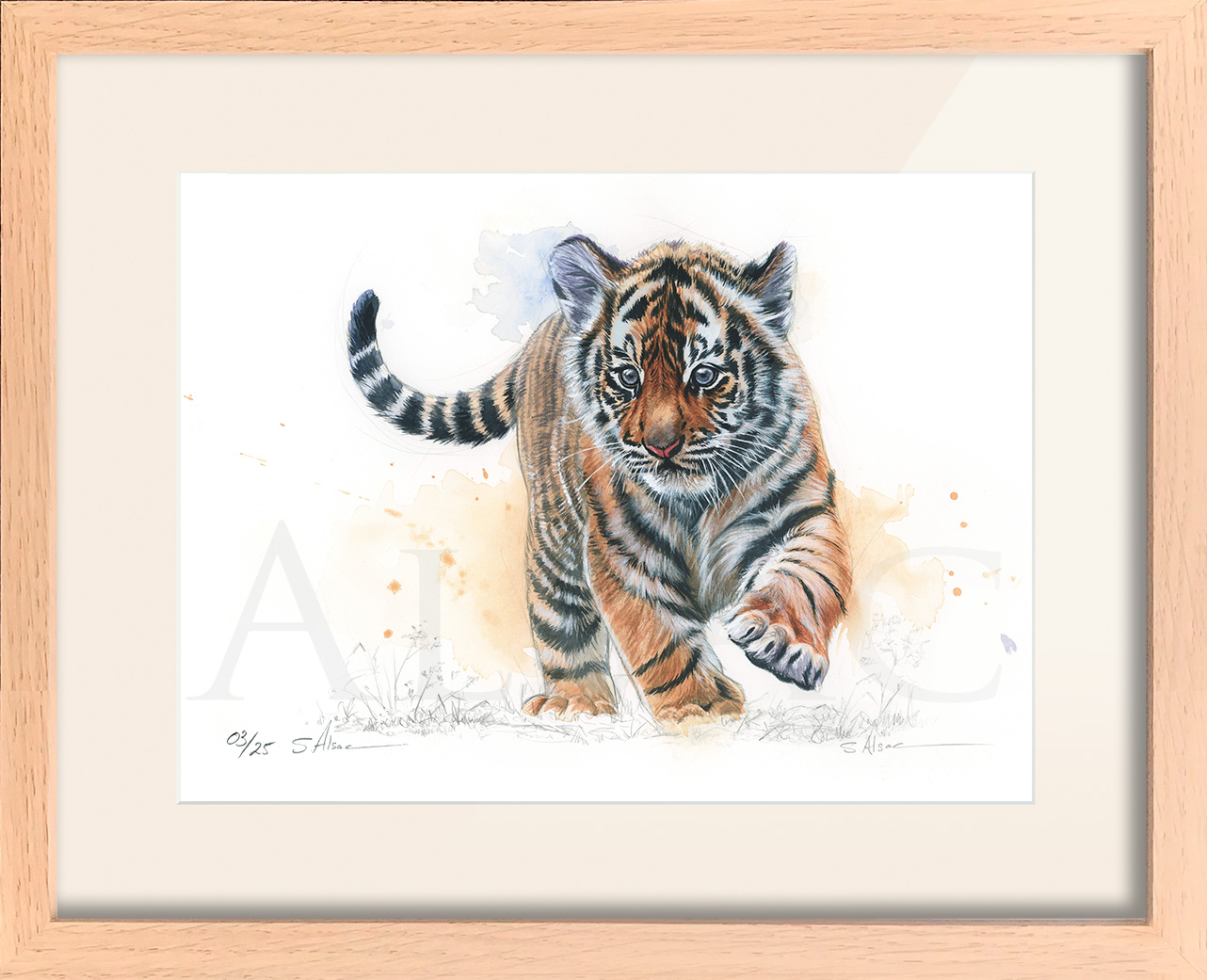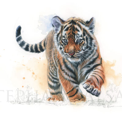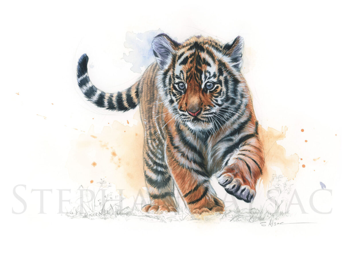 Illustration originale à l’aquarelle réalisée par Stéphane Alsac, artiste animalier contemporain: Un bébé Tigre du Bengale réalisé à la mine de plomb et rehaussé à l’aquarelle.