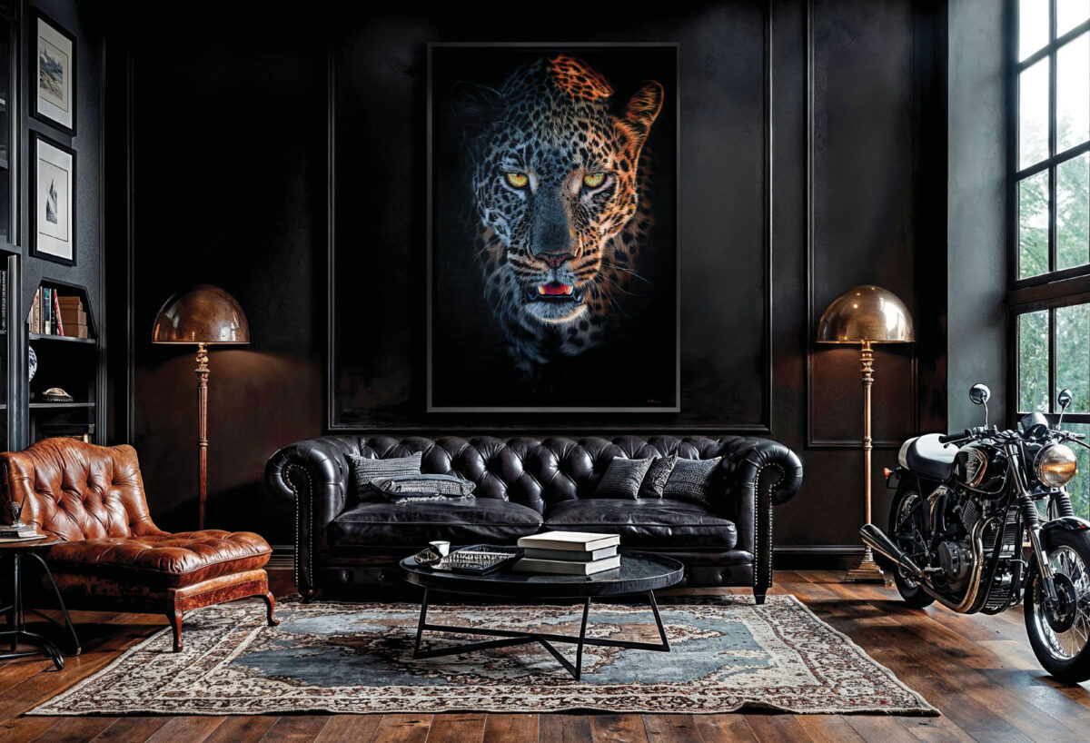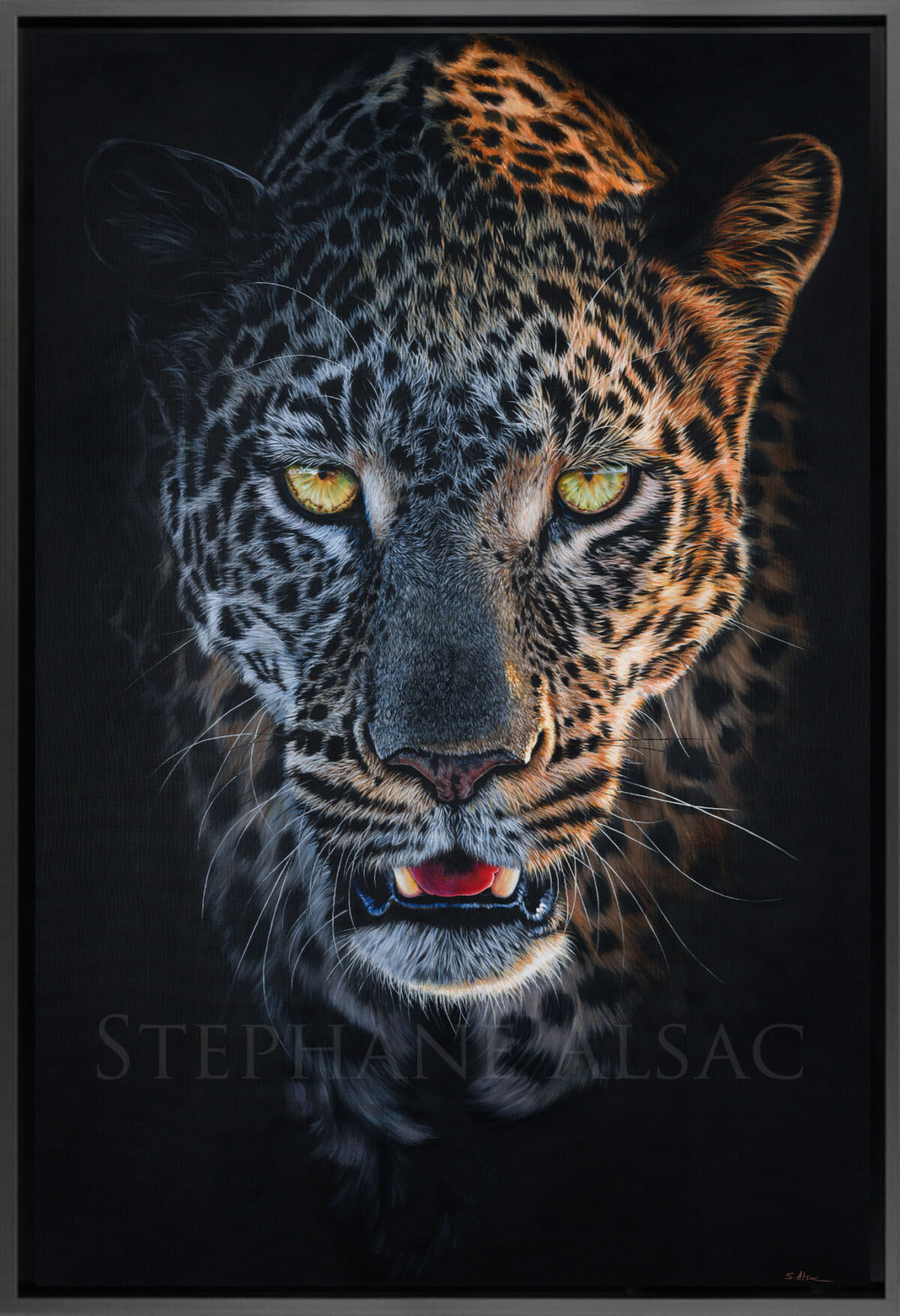 Ce contraste entre l’éclairage dramatique et la taille monumentale du portrait accentue la majesté du léopard. « Invictus » ne se contente pas de représenter un animal; il incarne une figure de puissance et de mystère, nous poussant à réévaluer notre relation avec le monde naturel et les êtres qui le peuplent.