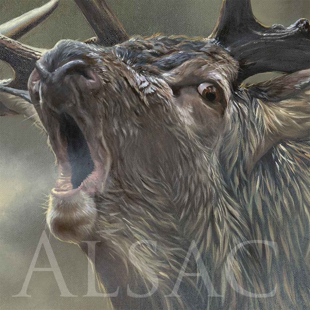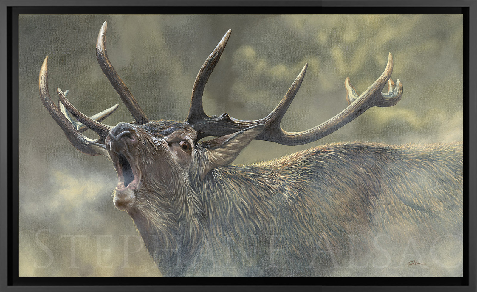 De mi-septembre à début octobre, la période du rut du cerf est l’occasion d’observer le brame et ce dans des conditions de lumières absolument magique. J’ai voulu retranscrire, dans cette peinture, l’ambiance de petit matin humide mais ensoleillée avec la lumière qui vient illuminer la respiration du cerf.