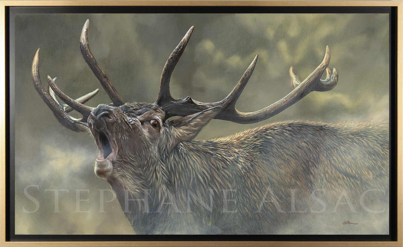 Stéphane Alsac est un peintre contemporain hyper-réaliste, c’est à dire que ses tableaux, le plus souvent ses peintures à l’huile, représentent les animaux avec un réalisme étonnant proche de la photographie. L’idée n’est pas ici de reproduire une photo, mais bien de sublimer le Cerf et le rendre « plus vrai que nature ».