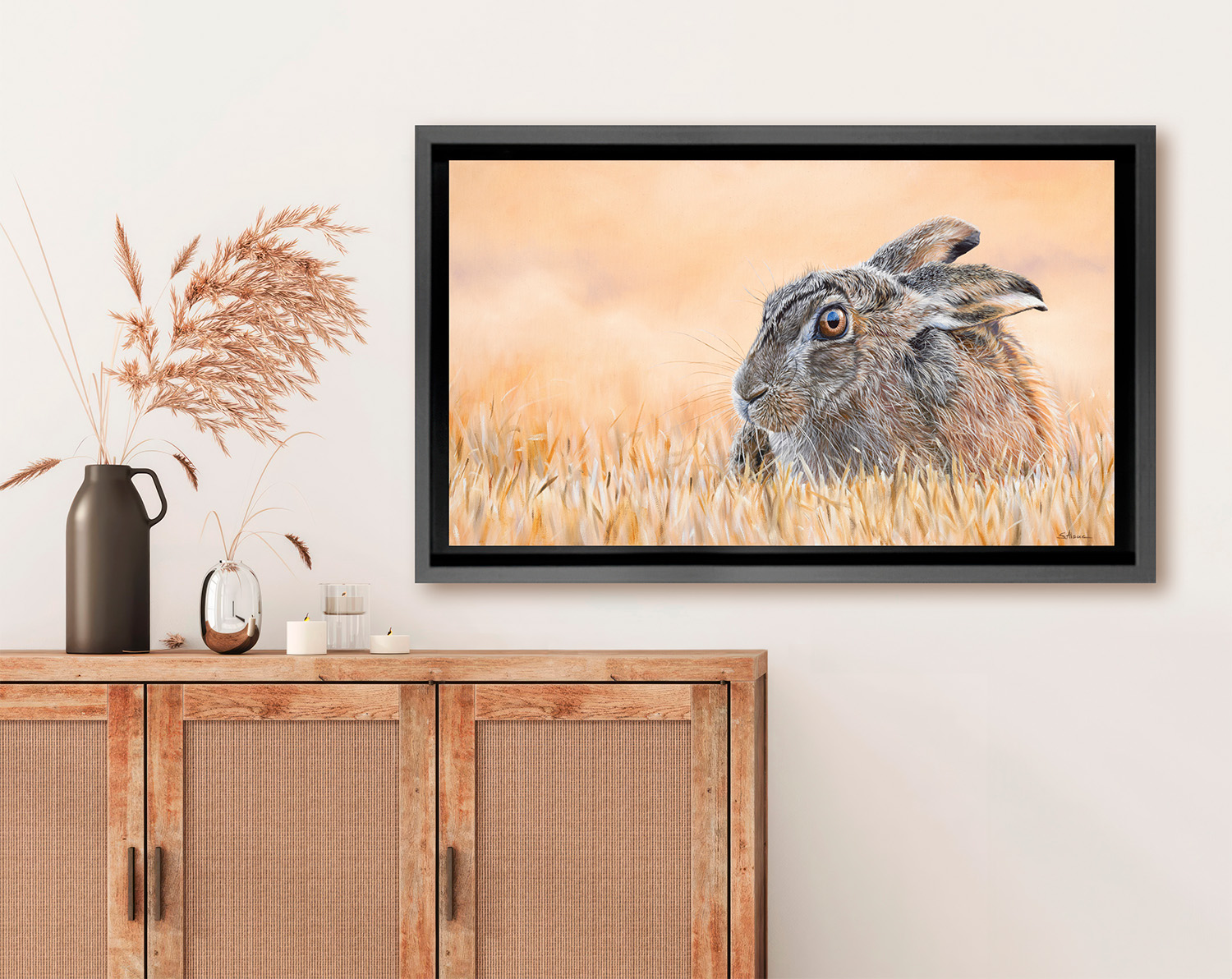 - Encadré en Caisse Américaine : Toile tendue dans une caisse américaine noire mate, livrée prête à accrocher.