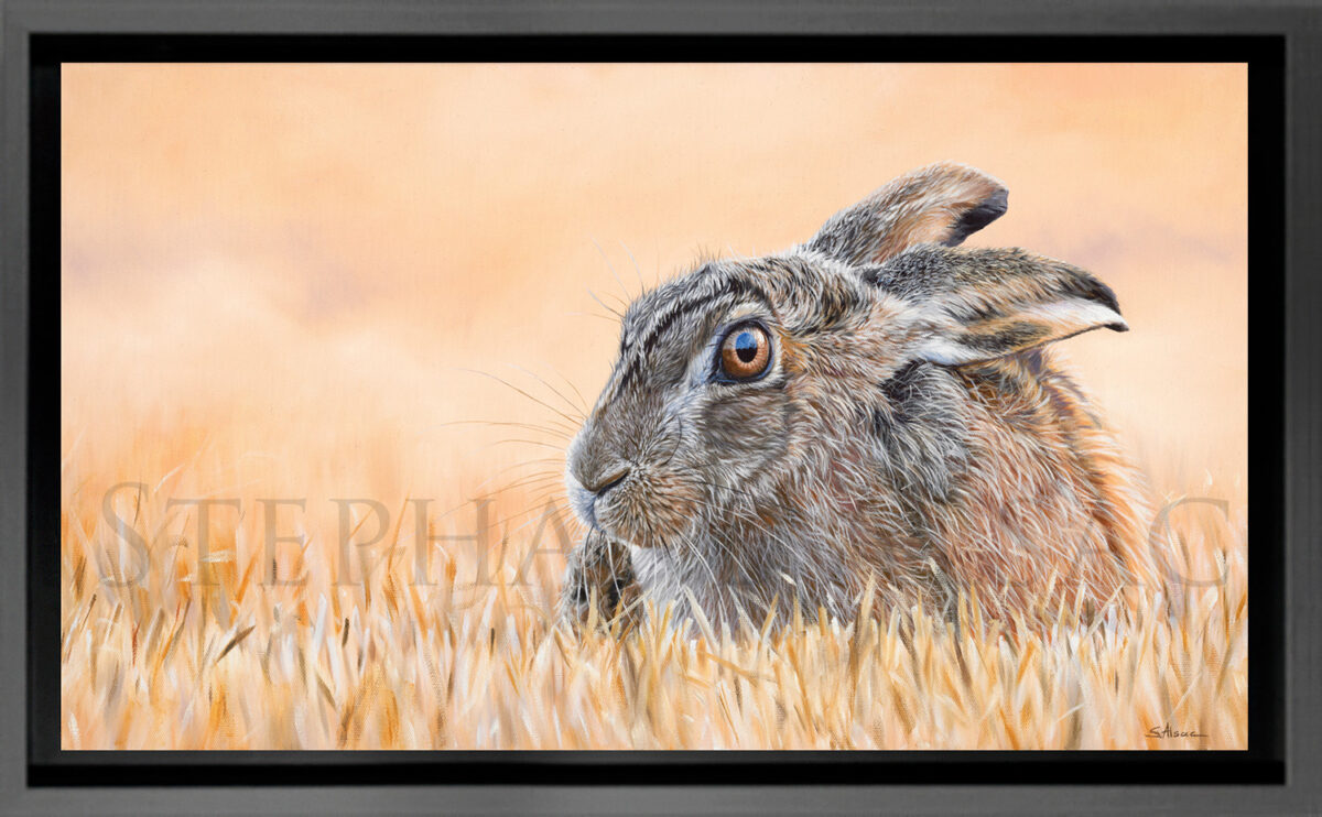 L’Artiste Animalier Stéphane Alsac présente ici son dernier tableau : une peinture à l’huile représentant un lièvre dans les pailles fraichement coupées . Il s’agit d’un tableau de 70 cm de long, d’un style figuratif hyper-réaliste.