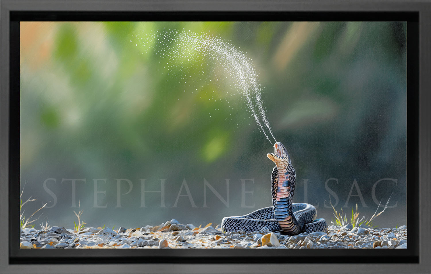 L’Artiste Animalier Stéphane Alsac présente ici son dernier tableau : une peinture à l’huile représentant un Cobra cracheur du Mozambique. Il s’agit d’un tableau de 70 cm de long, d’un style figuratif hyper-réaliste.