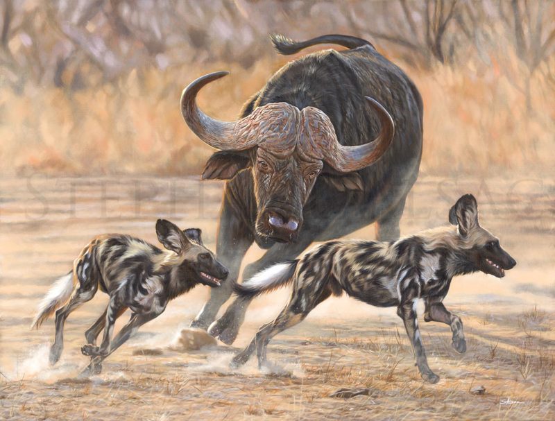 tableau-peinture-toile-buffle-caffer-charge-lycaons
