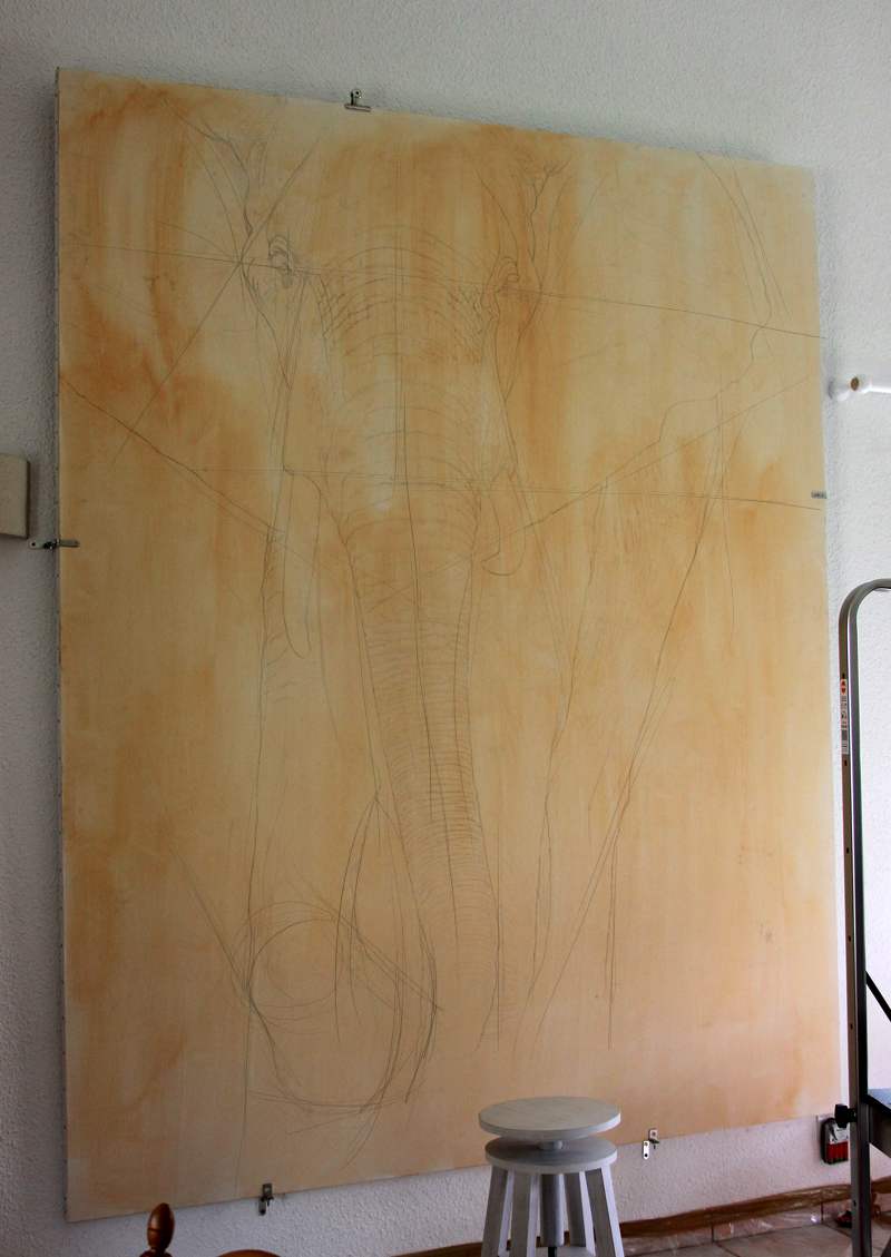 Une fois le tableau bien arrimé – il m’a fallu quand même l’accrocher par 3 pitons derrière + 4 fixations en bas et sur les côtés- on peut commencer à travailler.